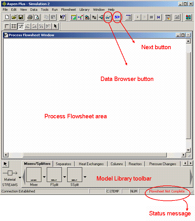 The next screen will be the main Aspen Plus™ application window with a blank Process Flowsheet Window in it. Let’s familiarize ourselves with the interface.