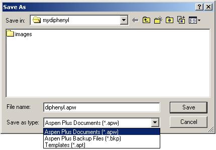 As with any other complex software application it is a good practice to save your work frequently. For the first save operation select Save or Save As from File menu and save your work. There are three saving modes: the Aspen Plus Document, Aspen Plus Backup file and Template.