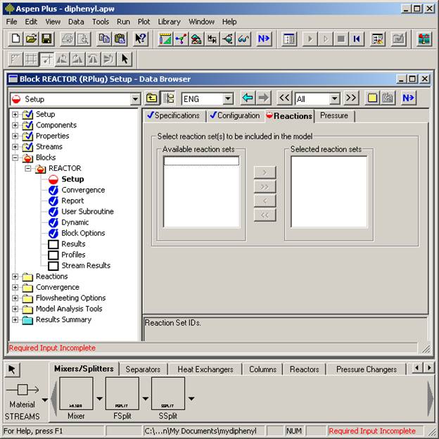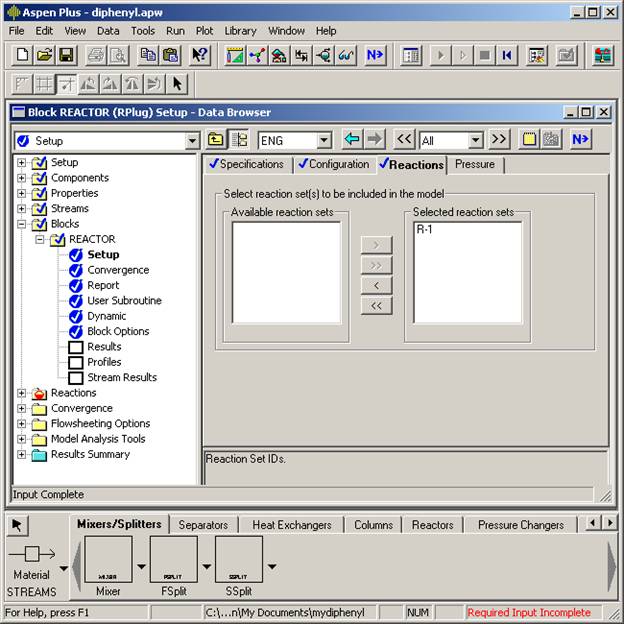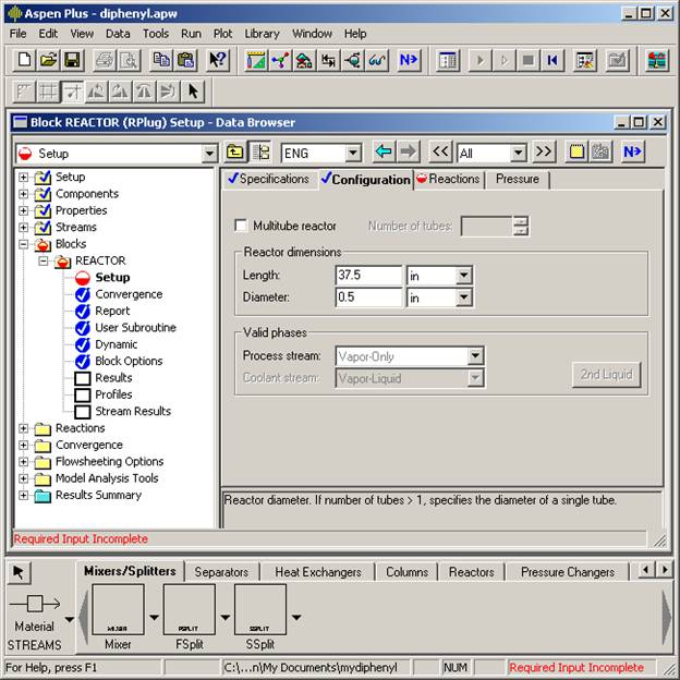 Now we will specify the reactor specifications. First, we assume isothermal operation at inlet conditions.