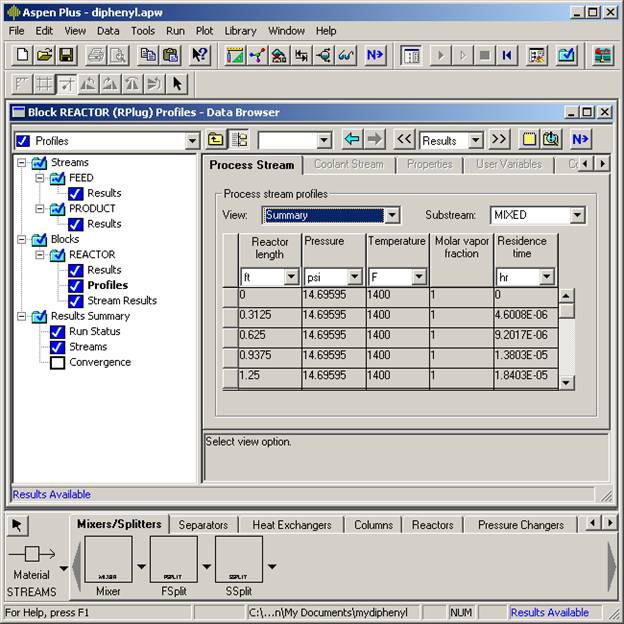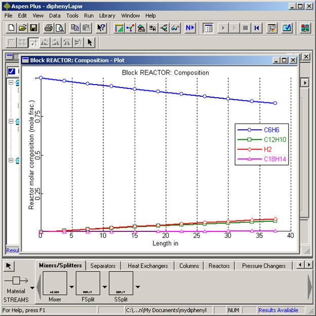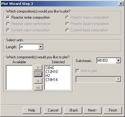 The profiles screen is where you will find concentration, temperature, etc. profiles along the reactor. These results can be analyzed by the Plot Wizard entry from the Plot menu.