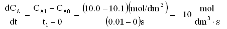 At t = 0 then CA = 10.1 mol/dm3. A moment later at t = 0.01 sec then CA = 10.0 mol/dm3. If dCA/dt were to be positive, the concentration of A would increase with time. However, A is being consumed so the concentration of A is decreasing with time. For small times we use a different formula to find dCA/dt.