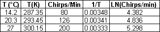 Using data from the chart below (P3-3A), graph ln(chirps/min) vs 1/T.