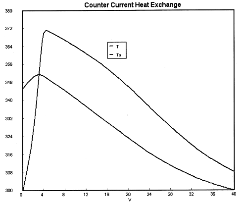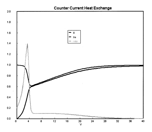 (c) Variable Ta Counter Current. Plot X, Xe, T, Ta and Rate of disappearance of A when there is a heat loss to the coolant and the coolant temperature varies along the length of the reactor for V = 40 dm3. The coolant enters at 300 K. How do these curves differ from those in the adiabatic case and part (a) and (b)?