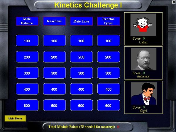 This game allows students to test their knowledge about general mole balance equations, reaction rate laws, and different types of reactions and reactors. Individual students will find themselves going head-to-head against computer opponents in an interactive game with timed responses. Twenty multiple-choice questions are selected from a pool of approximately 100 possible questions, so the game will be different every time. The questions fall under four main categories: mole balance, reactions, rate laws, and reactor types; and there are five difficulty levels within each category. Each correct answer will earn the student a given number of points; the more difficult the question, the higher the point values.