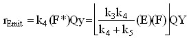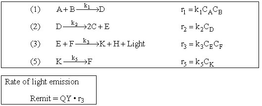 We also assume that the Flourophore becomes inactive once it emits light. With these simplifications reaction (4) is no linger required and Mechanism (2) is given by the equations in the following box.