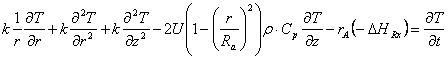 where Dp denotes the diffusion coefficient, Ci is the concentration of species i, U is the flow velocity, R gives the radius of the reactor, and ri is the reaction rate. See the derivation of the mass balance.