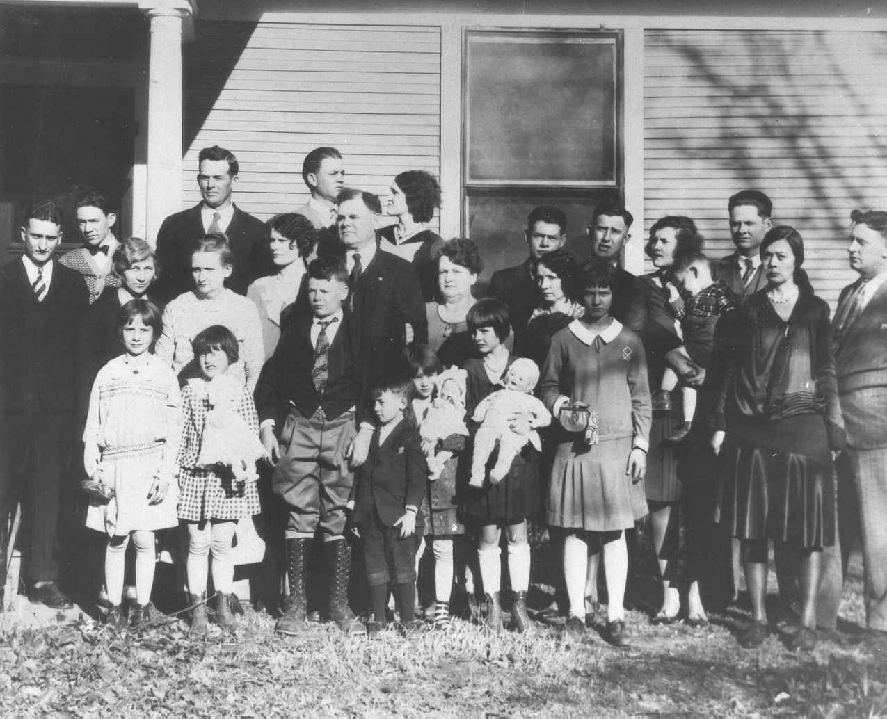 | Pictured left to right, front to back: Eugene Womack(far left), George Jordan, Opal Womack(young girl in front), Valera Womack, Lois Womack(squinting, holding doll), Jacklyn Lina Womack, Ira Womack(in back of Jacklyn), Donnie Duncan(woman next to Jacklyn, in middle), Charles "Buddy" Duncan(young man with tie, in front and slightly right of Donnie), Tom Jordan(in back, facing right), Elmer Duncan(behind and slightly to the right of Charles), Nathan Womack(young boy, front row, facing left), Mary Evelyn Jordan(youngest girl, holding doll, next to Nathan), Abbie Jordan(back row,facing left towards Tom Jordan), Leamie Duncan(behind the two girls holding dolls), Margaret Jordan(front row, holding doll, underneath window), Reece Duncan(man on back row directly beneath window), Grace Womack(in middle row, in front of Reece), Hazel Womack(front row, white collar, holding scarf in right hand), Jerry Womack(back row behind Hazel), Helen Daisy M. Womack(back row holding child), William "Bill" W. Barron(child in Helen's arms), Sam Barron(back row next to Helen), Bessie Womack(last woman on right), Homer Womack(man on far left) |