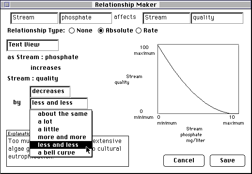 Next, the student can define relationships between the factors (how the value of one factor affects the value of another). Model-It supports a qualitative, verbal representation of relationships, rather than requiring formal mathematical expressions. Students can define a relationship simply by selecting descriptors in a sentence, e.g., “As stream phosphate