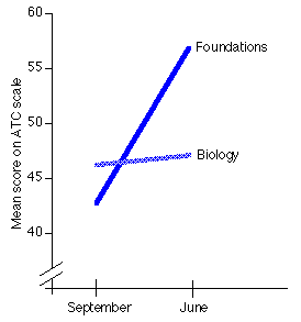 An effect size of 1.30 standard deviations was calculated by subtracting the June ATC means from each other and dividing by the standard deviation of the Biology group. While the two groups started out in September with similar means on the ATC scale (and Foundations a little bit lower), the Foundations group ended up in June well over one standard deviation above the Biology group.