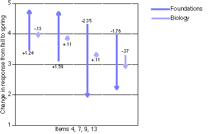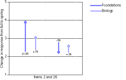 On two of the items, t-tests showed both groups' June responses to be significantly different from their September responses (item 2, p<.001 for both; item 26, p<.05 for both). Figure 2 shows a change diagram in which the fall responses are indicated by the tail of the arrow, and the spring responses by the head. In the case of item 2, both groups tend to agree more with the statement that information they collect will be used by others; however, the change in the Foundations' responses far exceeds the change in Biology students' responses. As for item 26, which deals with giving up or doing the easy part when work is difficult, the group means shifted similar amounts but in opposite directions, with Foundations students tending to agree less and Biology students tending to agree more. The similarities in item 2 might be attributed to the fact that the same teacher taught both classes, and some teaching techniques may have been in common between the two classes, causing similar change. The differences in item 26, however, are not intuitively tied in to either traditional or project-based pedagogy.