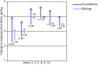 As indicated above, the two groups responded differently to only 8 items in the fall (no difference between means on 38 of 46 items), on the whole instrument. Of those 38 items for which there was no difference in the fall, 14 of them showed differences in the spring, and of those 14, Foundations spring means changed significantly from fall means on 6 of them (items 2, 3, 5, 6, 8 and 18, p<.01 for all except for item 5, p<.05) while Biology showed no significant change. Again, a closer inspection of the patterns of change is revealing (see figure 4). For each of these items, the Foundations attitudes changed for the better while the Biology attitudes remained virtually the same (except for item 2, p<.01). These items dealt with information (information I collect is used by others, I figure out what information I collect means, I draw conclusions about information), solving problems (I answer questions that make me think about science problems, science helps me think and solve problems), and peer collaboration (I learn a lot from other students). This result is particularly significant when one considers the goals of the Foundations I class. The teachers who developed the course consistently place an emphasis on providing opportunities for students to identify and solve authentic science-related problems by collecting, analyzing and synthesizing real data, and this consistent emphasis seems, at least from the point of view of students' attitudes, to be having a positive effect.