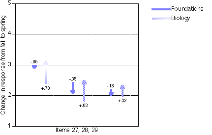 On three other items (27, 28, and 29), statistically significant differences appeared for the Biology scores from fall to spring (p<.05). Figure 5 shows a change diagram for those three items. For item 27, Foundations started off different from Biology, ended up the similar; for item 28, they started off different and ended up different; for item 29, they started off the similar and ended up different (all p<.05). Interestingly enough, these items all deal with classroom work habits (I get answers from my friends, sometimes I copy from my friends, I guess a lot to finish quickly). The change diagram shows that the Biology students tended to agree much more with these statements as the year progressed, while Foundations students tended to agree less, although not significantly. Perhaps in the traditional, content-delivery classroom, if students can't keep up they tend to resort to counter-productive work strategies in order to finish their work.