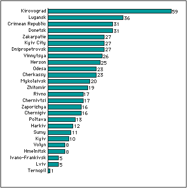 Distribution of the negative responses "completely distrust" the President of Ukraine, L. Kuchma