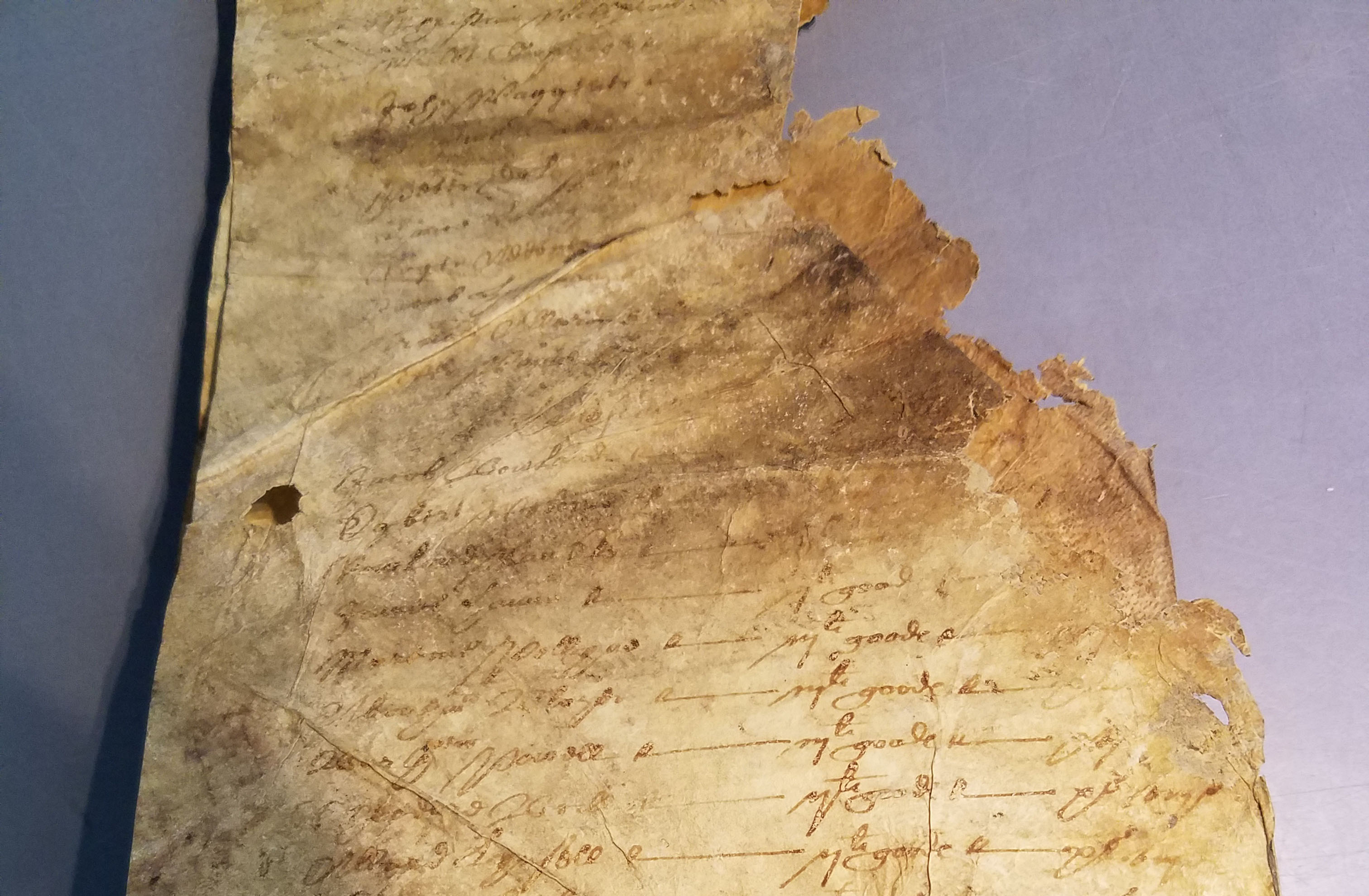 The document is badly damaged, stained and faded, and some sections are lost.
