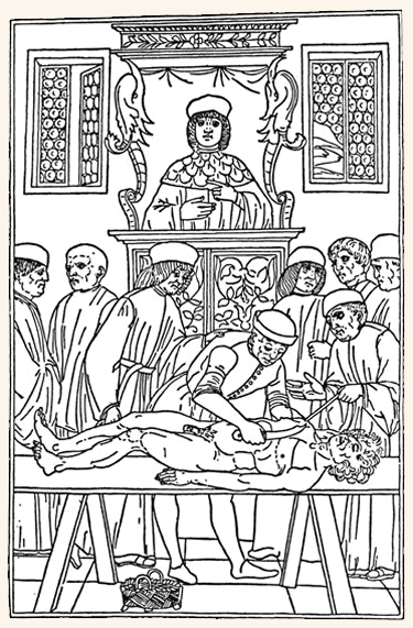 Before Vesalius revolutionized dissection practice, anatomists performed public dissections through a highly-ritualized and –hierachized practice. Three professionals participated in the dissection, each with specific roles during the performance. First, a professor of anatomy (who was a physician, the most-esteemed form of medical practitioner) would sit on a raised dais above the cadaver; from this position, he would read from an anatomical text (likely Galen’s), describing the organs and their presumed functions. Below him, a demonstrator (who was a surgeon, a medical practitioner held in lower esteem because he physically interacted with the patient or, in this case, cadaver) performed the action dissection. Standing next to the demonstrator, the ostenor would use a wand to point to the specific organ being described by the professor and revealed by the demonstrator. 1
