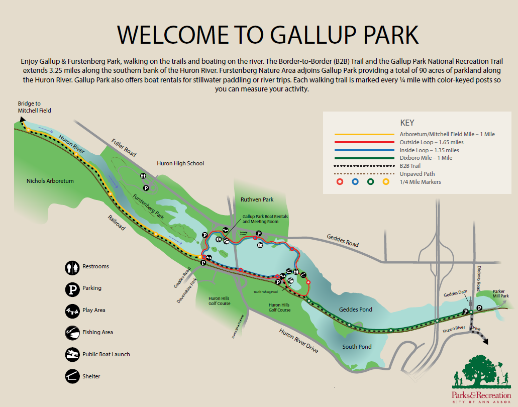 Gallup Park is a 69-acre park and is Ann Arbor’s most popular recreation area. It is located along the Huron River and Geddes Pond with scenic walkways that traverse small islands with bucolic pedestrian bridges. The park contains two playgrounds, a canoe livery, picnic areas and grills scattered throughout the park, and two picnic shelters.