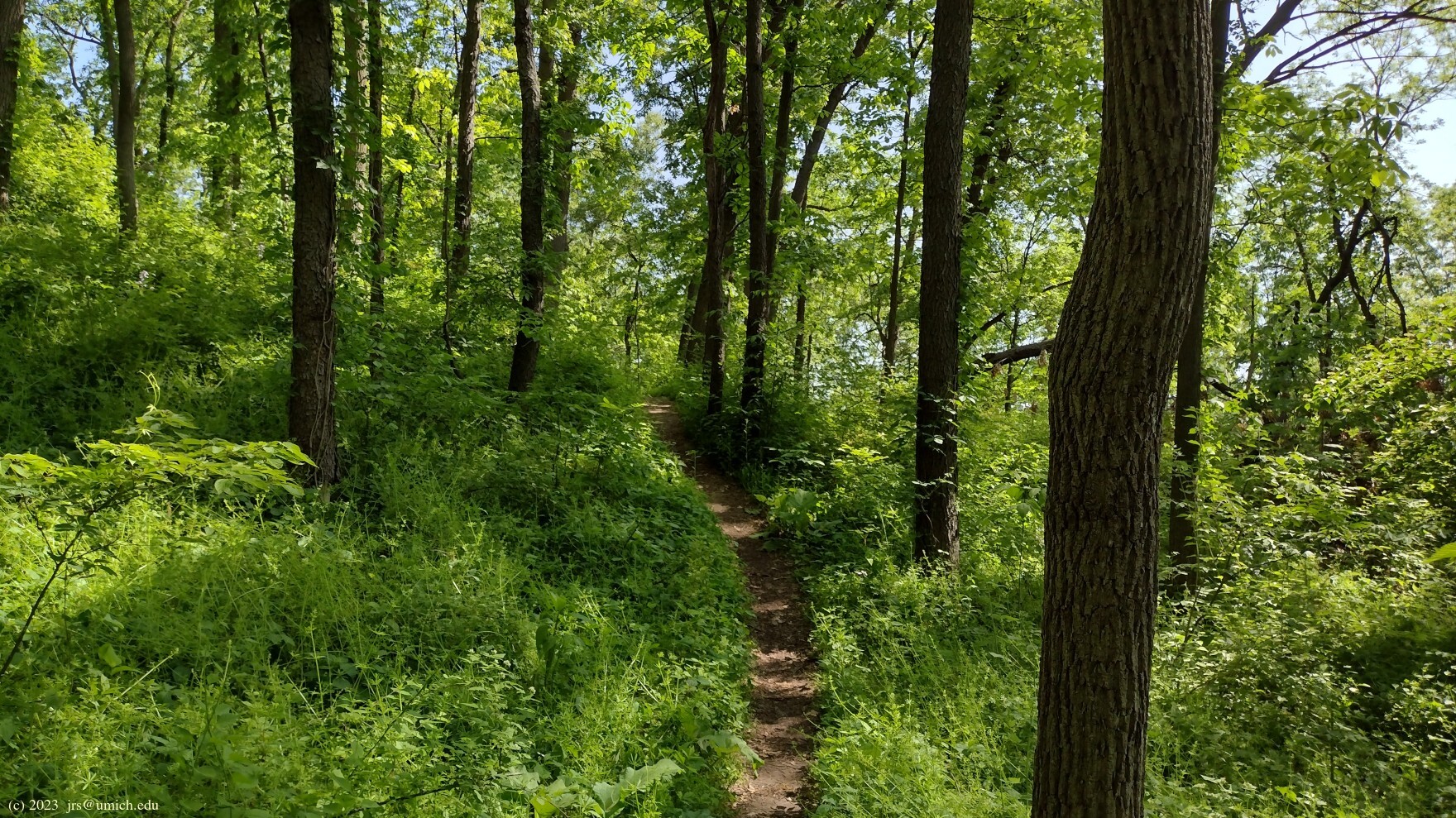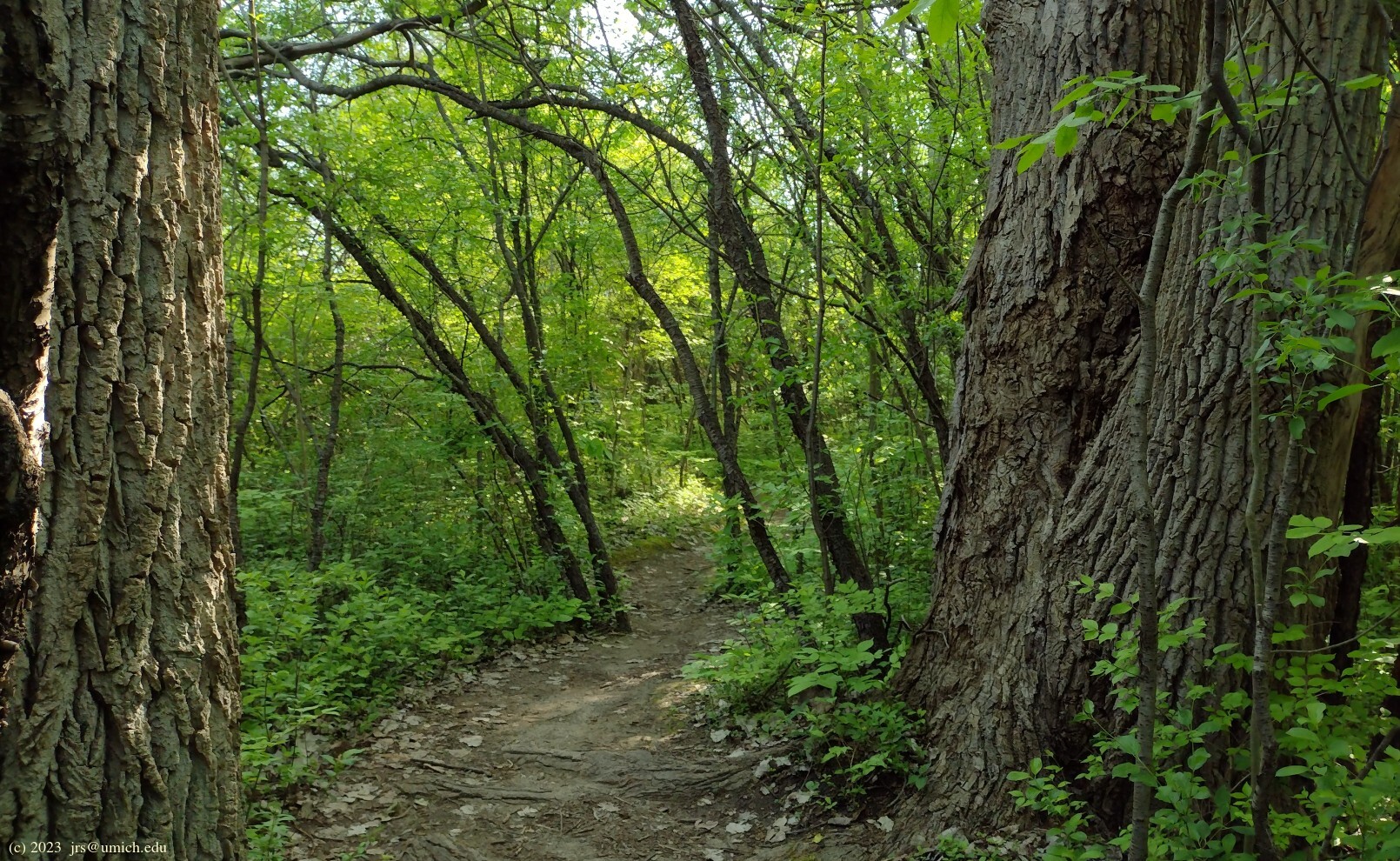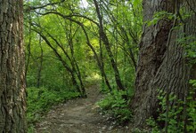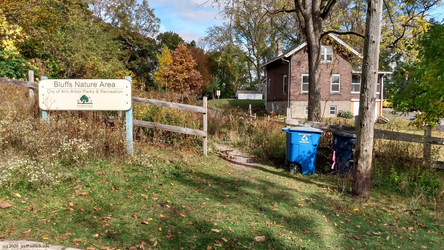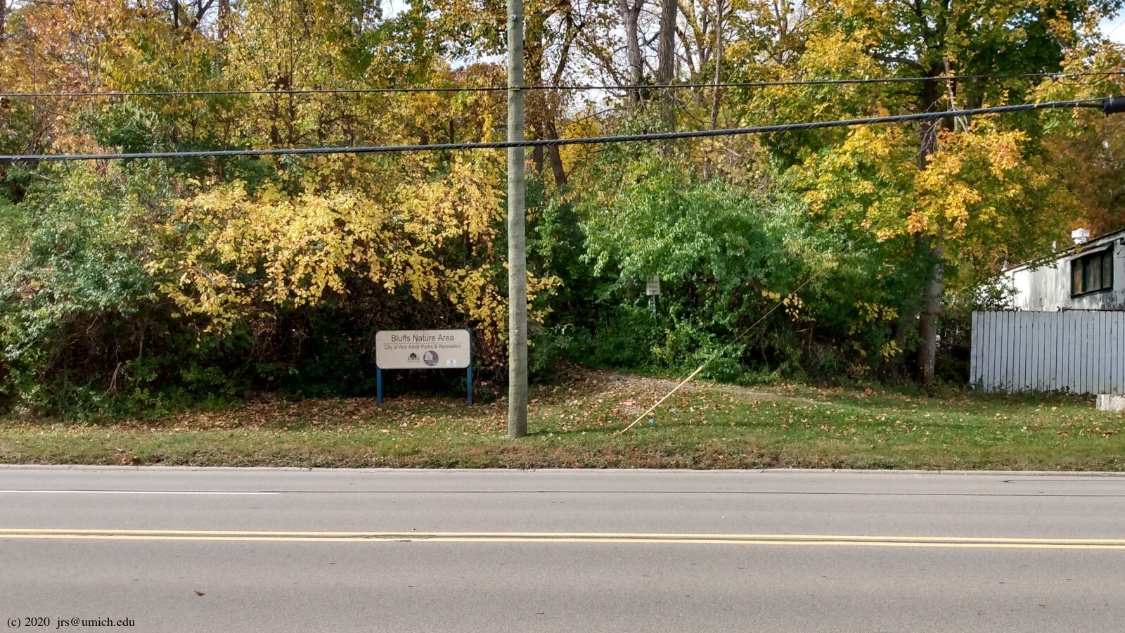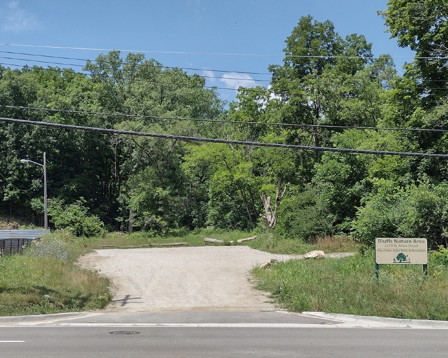 Bluffs Nature Area is ... located on a glacially formed ridge over North Main Street. [It] has a variety of natural features including an oak-hickory forest, wooded ravines, and an open field with remnant prairie species. There are also a few examples of large older trees including open grown oaks and a huge white ash. This area has long been a favorite place for bicycles, but hikers are also sure to enjoy the rugged trails throughout the park.