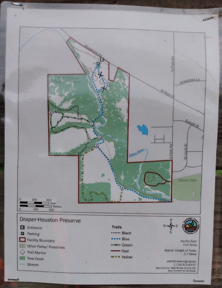 Some heavy storms in June of 2021 damaged a boardwalk that passes over a swampy area next to the bridge across the Saline River. The boardwalk had to be closed for repairs, resulting in nearly all of the preserve being unreachable from the parking lot and trailhead on Mooreville Road. Fortunately the repairs are complete as of April 2022 and the preserve is again fully open.