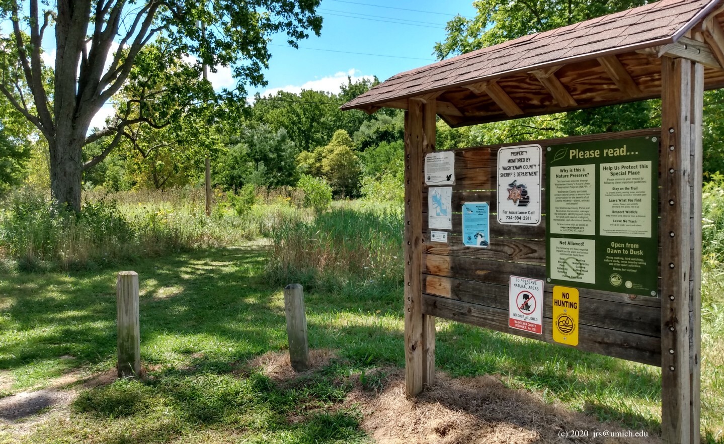Or, take the longer scenic route. From Main Street in Ann Arbor south of the stadium, head south on Ann Arbor-Saline Road until it ends about 14 miles later. Note that it becomes Saline-Milan Road after passing through Saline. The end is at a T intersection with Mooreville Road. Turn left onto Mooreville and look for the entrance to the preserve on the right after 0.4 miles.