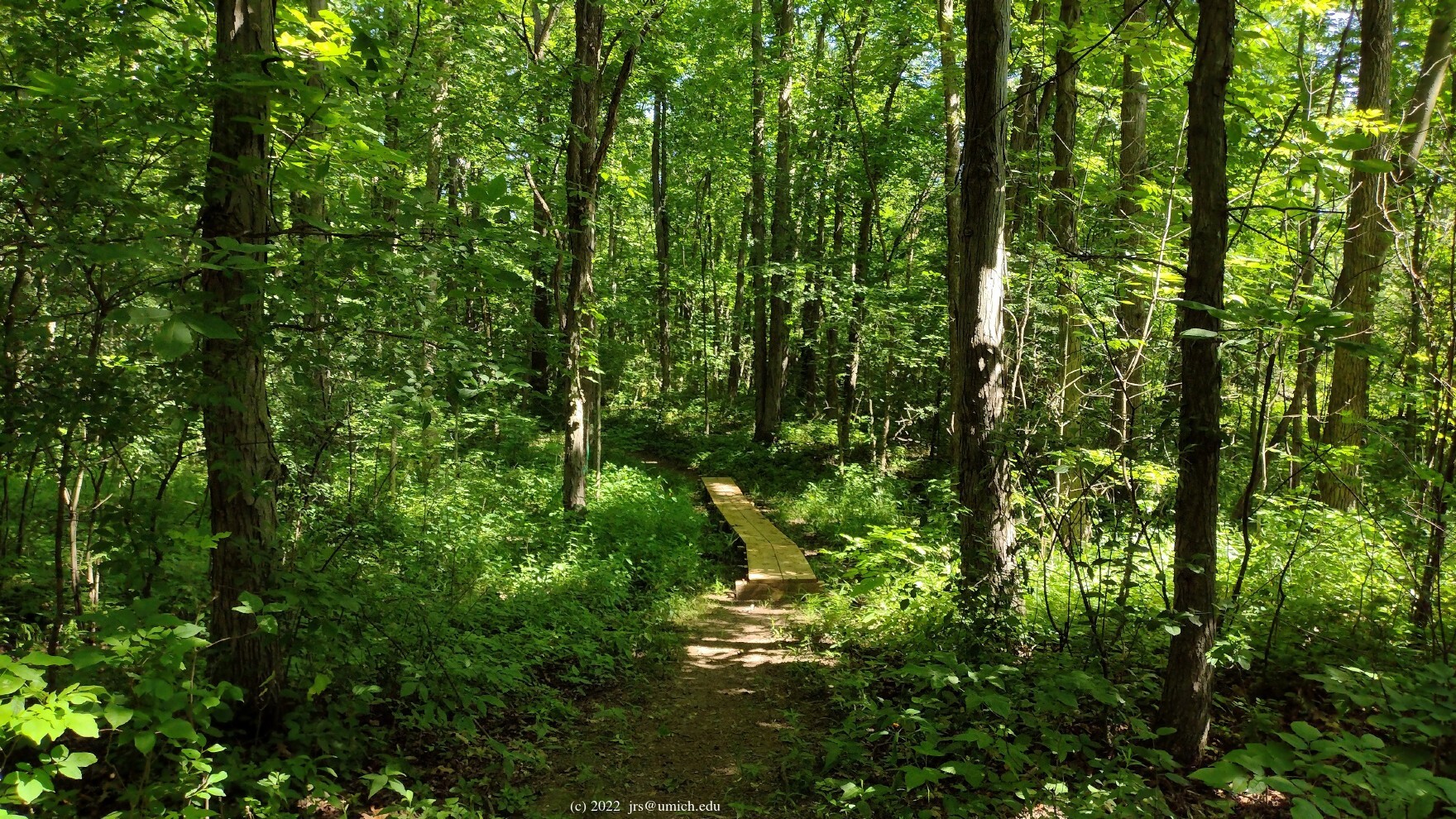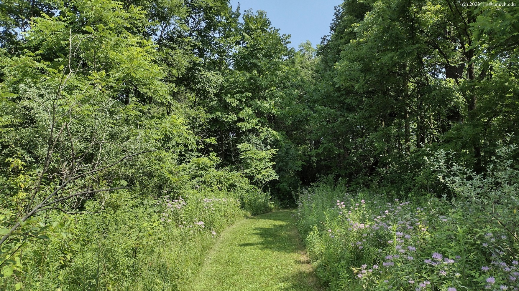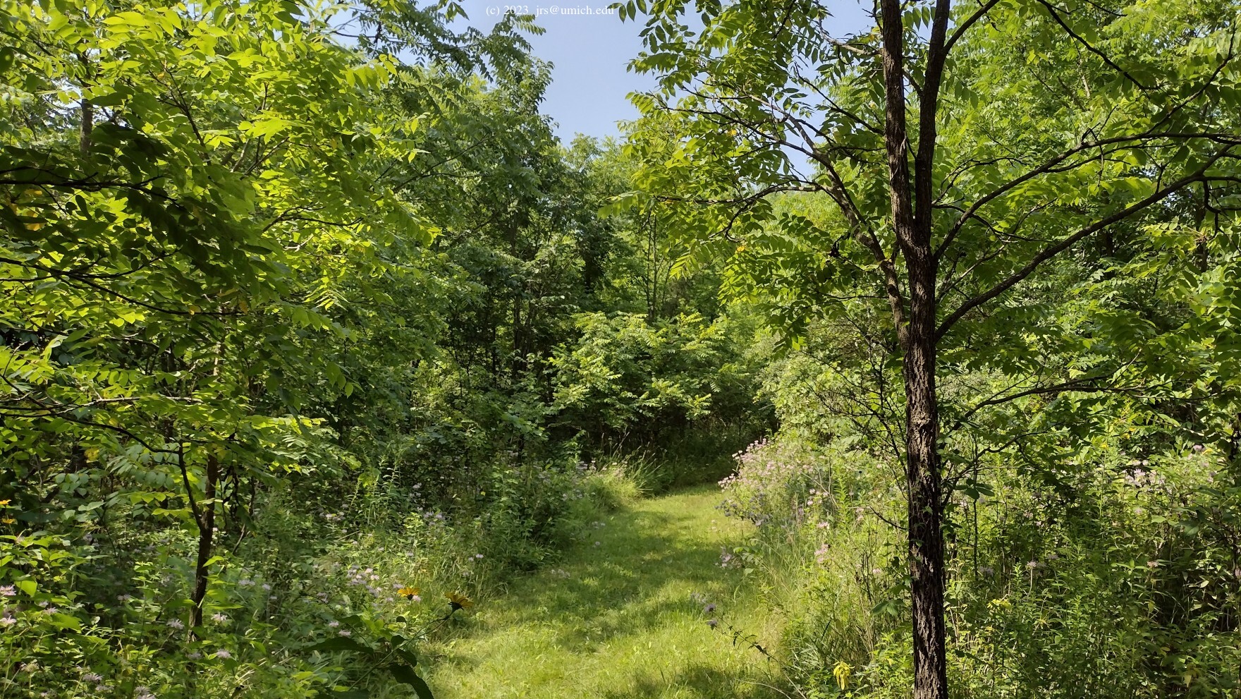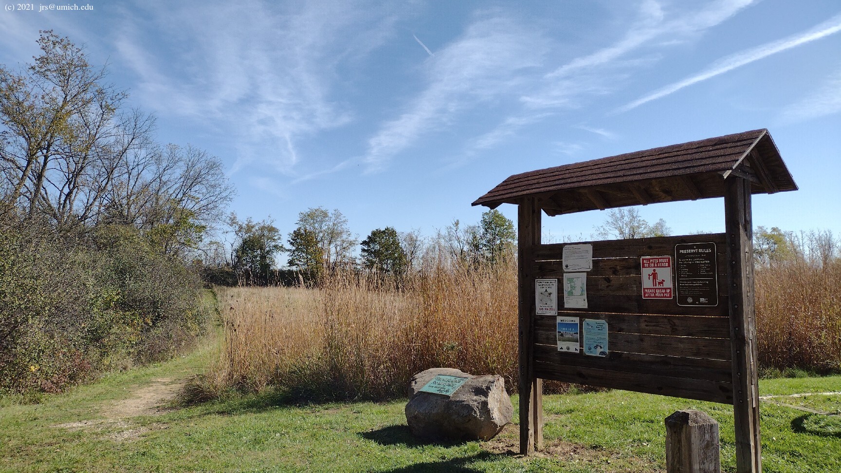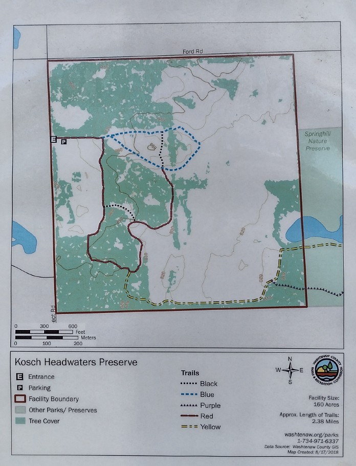 The OpenStreetMap is the best way to gain a quick understanding of how the five properties are situated. Kosch Headwaters and Springhill are southwest of the intersection of Ford and Berry, while Secrest, Weatherbee Woods and Schroeter Park are in the northeast quadrant. The Secrest Preserve in particular is a very recent addition. The land was acquired by the SMLC in 2019, and the hiking trail on it is new as of September 2021.