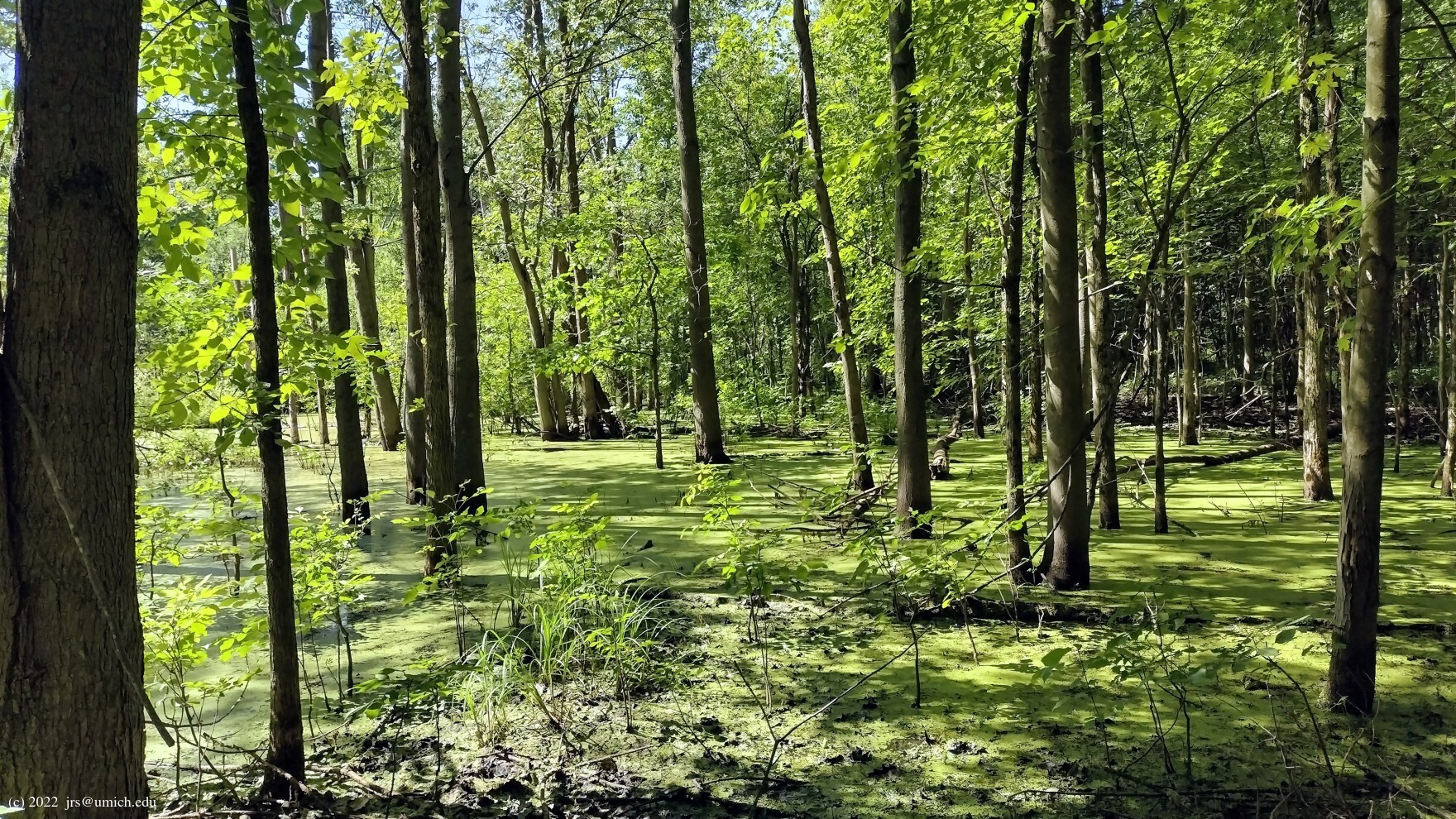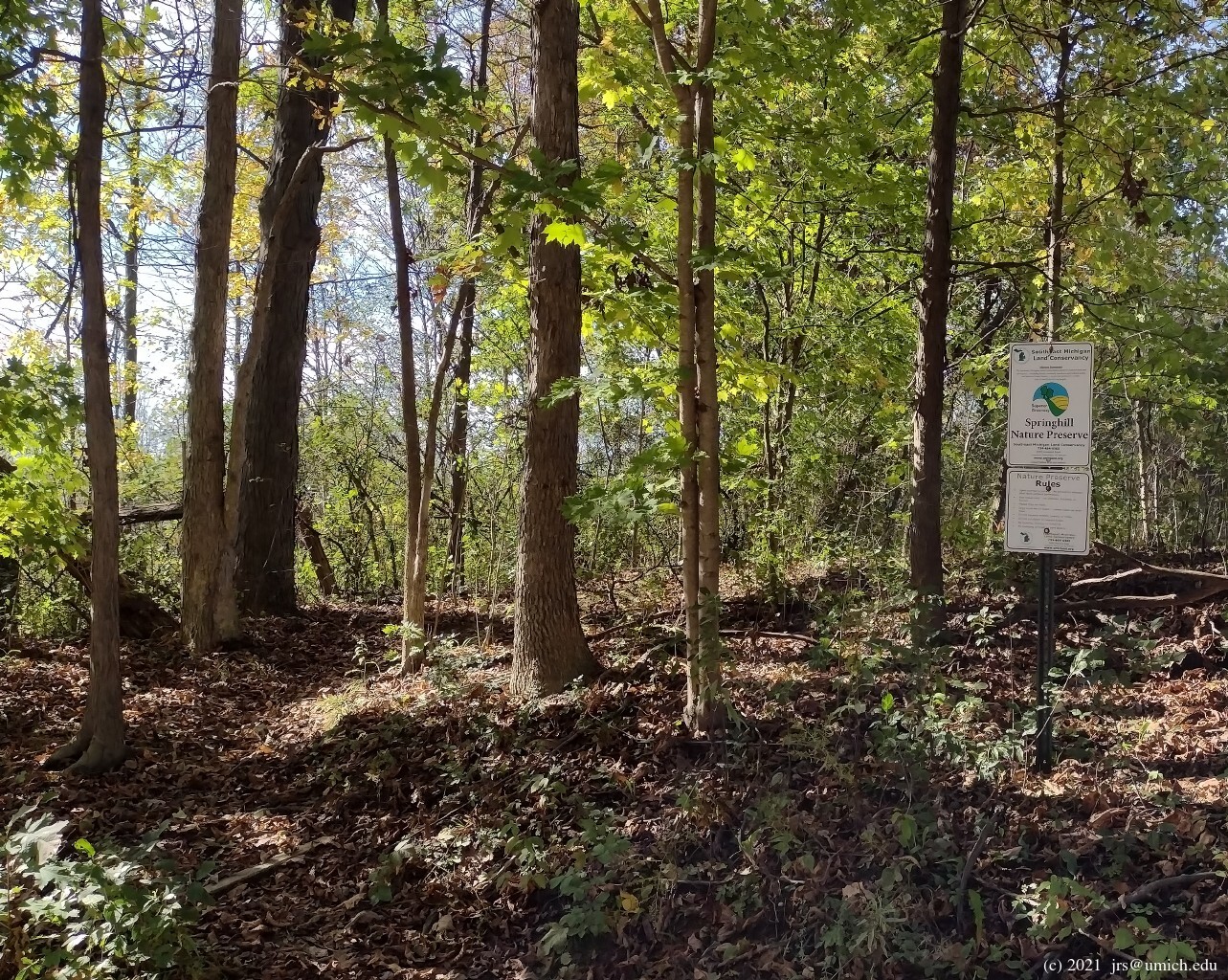 The [Springhill Preserve] consists of thirty acres of cattail and buttonbush swamp, mature beech/maple/oak woods, and an ancient apple orchard, located near Berry and Ford Roads in the heart of Superior Township. The swamp hosts a hearty population of spring frogs and a wide variety of water fowl, while the woods are frequented by deer, foxes, owls, hawks, and coyotes.