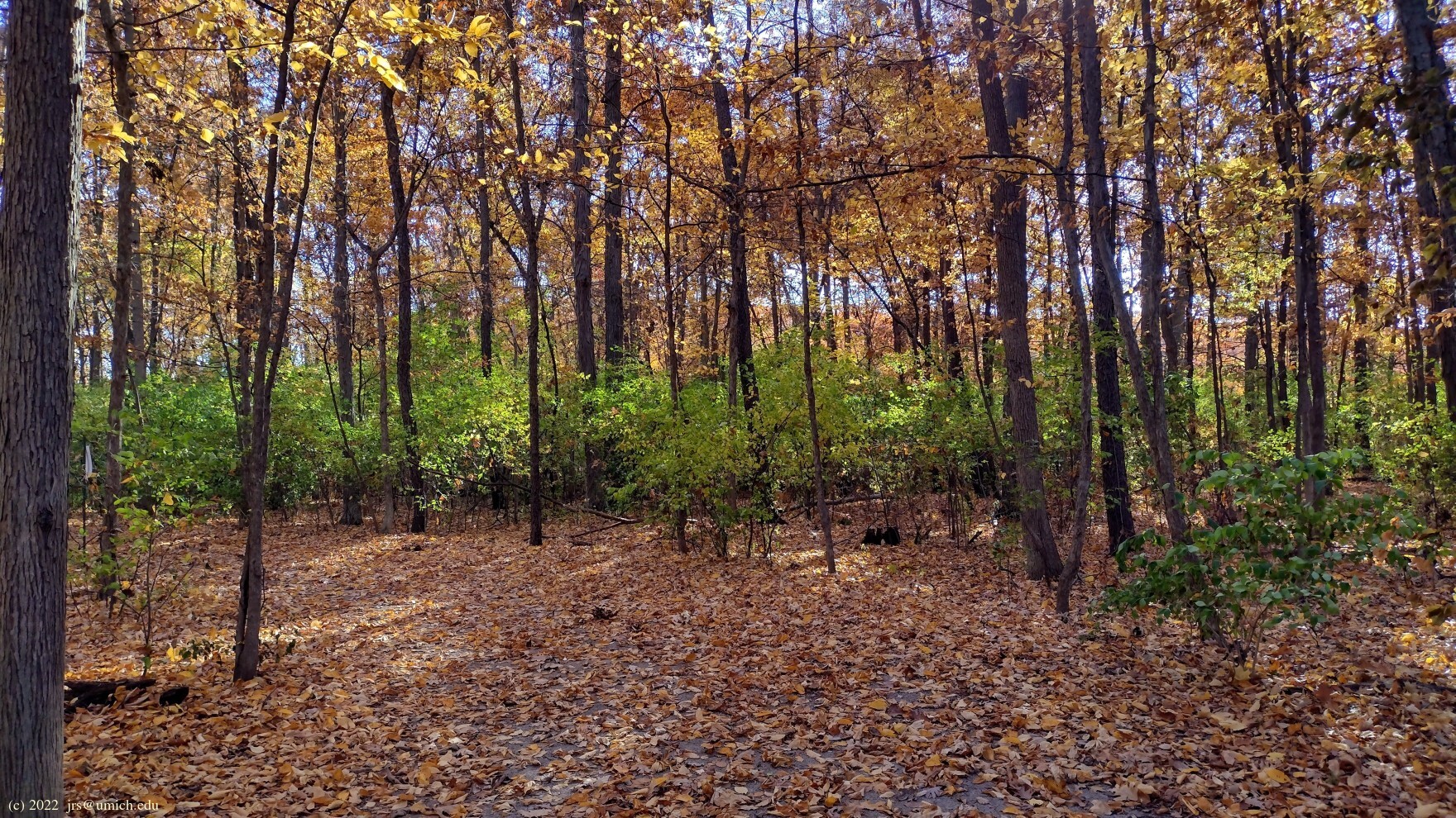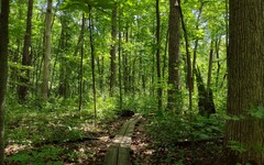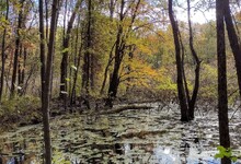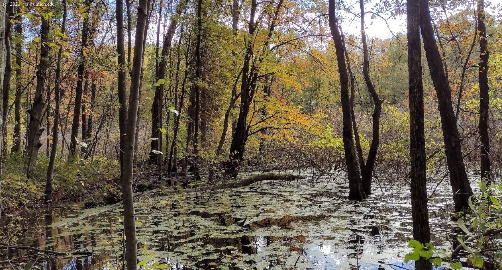 If you start your walk at Johnson from the parking lot you can enjoy a mile-long trail which passes through active farm fields, enters the forest and loops around the button bush swamp on the Harlie Smith boardwalk. A couple connectors to Lillie Park’s trails branch from the woodland trail. Fall colors are especially nice in this woodland. On your walk notice large oak and hickory trees marked with blue circles. These trees were marked at some point as “keepers” for the housing development that was to take place before the land was preserved by Legacy.