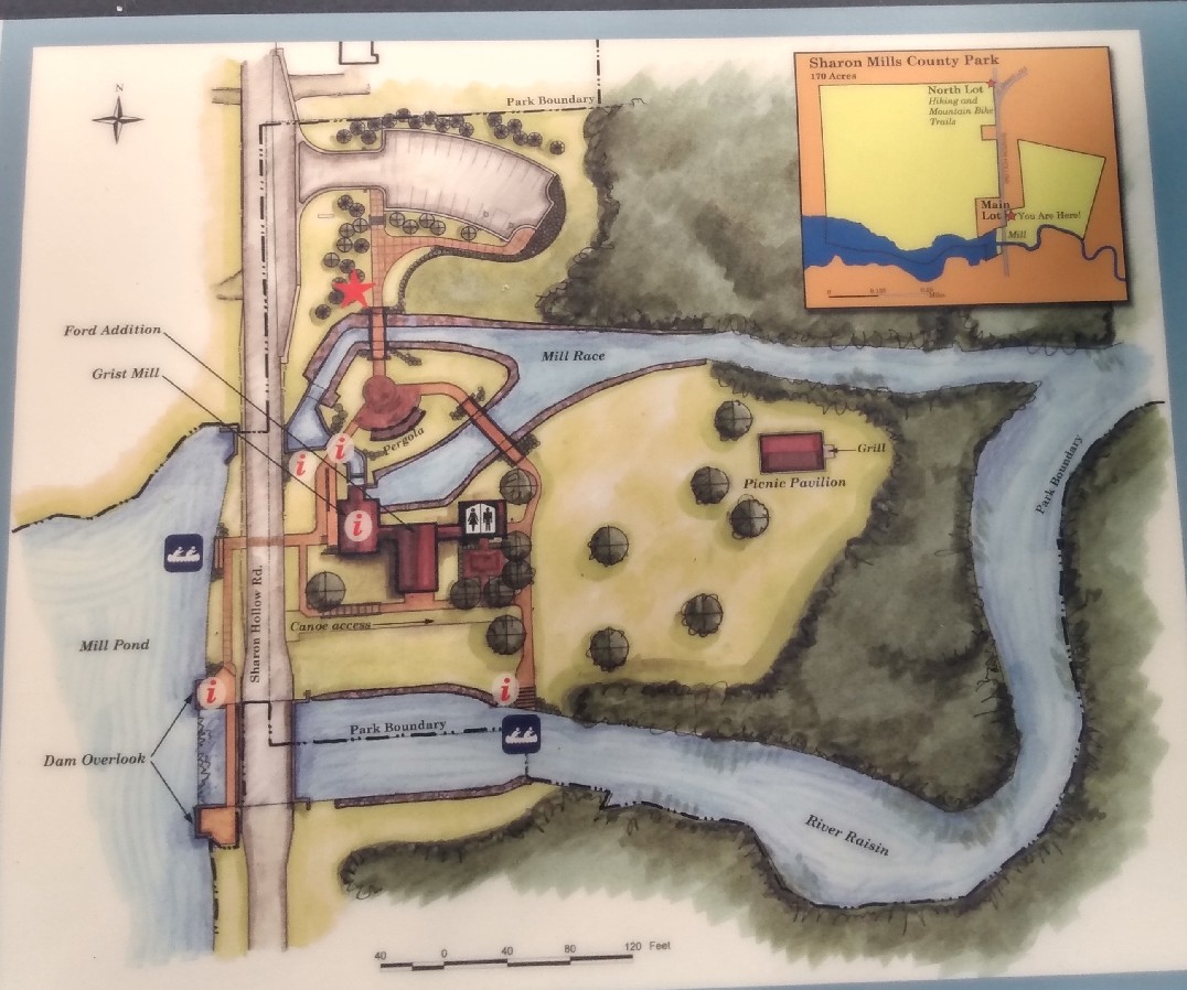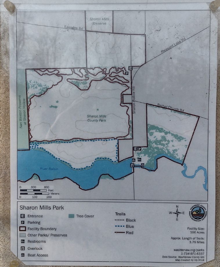 Adjacent to the preserve is Sharon Mills County Park, which features a former grist mill (restored and functioning as a museum), a picnic area, and canoe access to the River Raisin. For hikers, the main attraction of the park is a network of multi-use biking/hiking trails that wander through open fields and along wooded areas near the river.