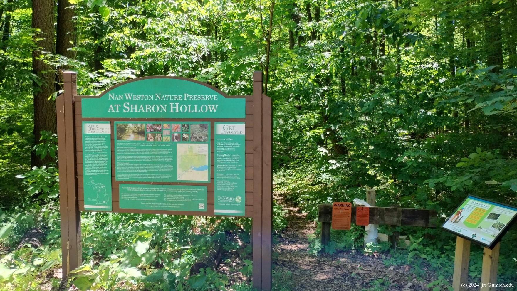 In Sharon Mills, bikes and leashed dogs are allowed on the trails, but no hunting. In the Nan Weston Preserve, neither pets nor bikes are allowed, but limited bow hunting for deer is allowed. It requires permits from the state DNR and from The Nature Conservancy.