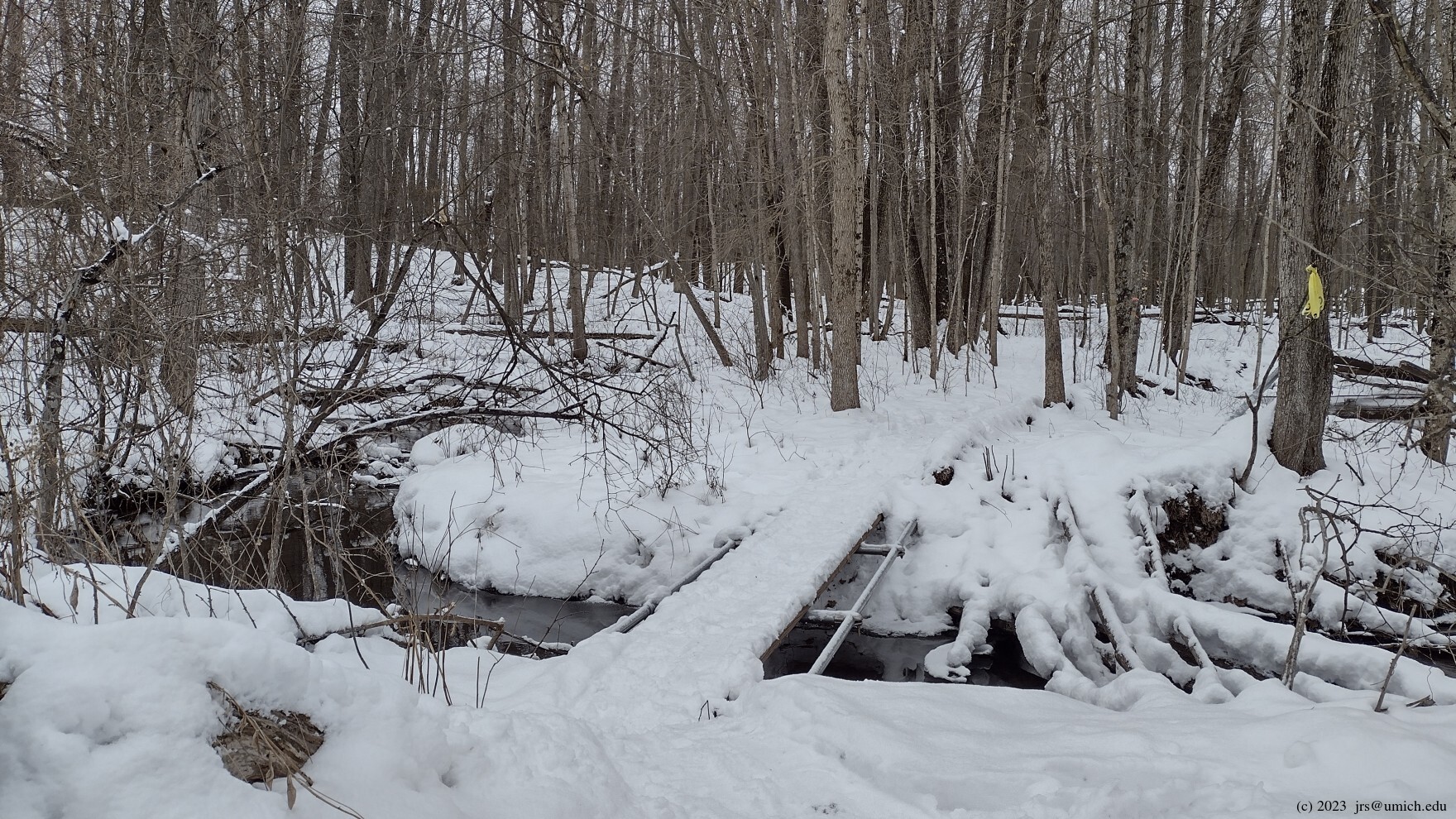 a haphazard bridge formed by a jumble of fallen trees.