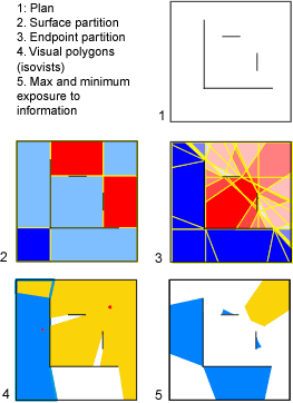 | The surface partition is produced by extending free standing wall endpoints. Partition lines are visibility thresholds for the appearance or disappearance of wall surfaces. The endpoint partition is produced by extending free standing wall endpoints and by producing all extensions of extendible visibility diagonals. Partition lines are visibility thresholds for the appearance or disappearance of edges. The resulting convex areas are informationally stable withrespect to visual information about shape. Visibility polygons (isovists) cover the area visible from a position. Areas of maximum and minimum exposure to visual information are visually linked to the greatest and to the smallest possible number of edges respectively. | ||||||||||||||