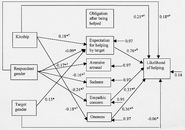 Another model of Batson et al.’s (1997) framework was also used, due to the ambiguity about the equivalence of perspective taking and oneness. This model is equivalent to the baseline model without the influence of oneness on helping or the direct effect of kinship. Because this is a nested model, it can be directly compared to the parsimonious model. As can be seen under ''Batson’s 2'' in Table 6, this model did not fit as well as the parsimonious model, Change in Chi-Square(5)= 61.31, p < .001. This figure is especially striking, because the parsimonious model constrains more parameters, the expected change in Chi-square would be in the opposite direction.