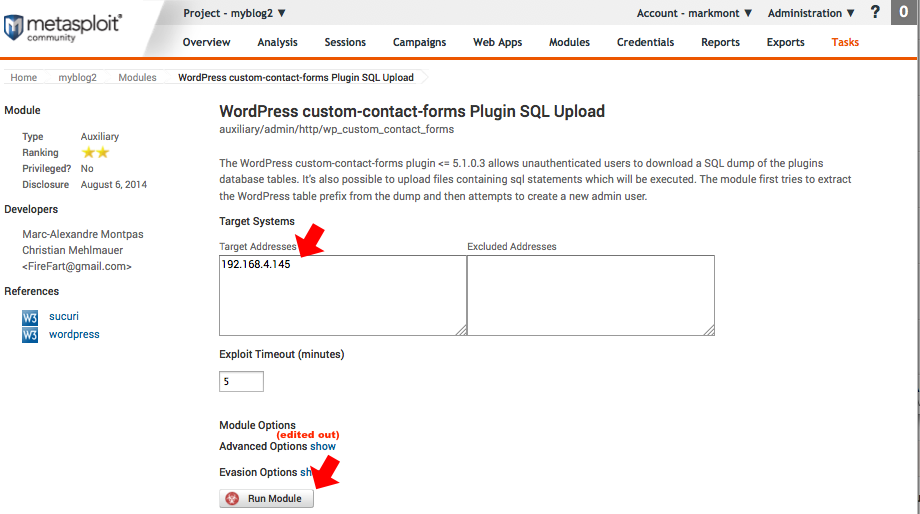 Although there are a lot of options that can be set, all we need to do is make sure that the IP address of our target system is correct and then click "Run Module". Metasploit will then attempt to create a new administrator user for us on the target WordPress site.