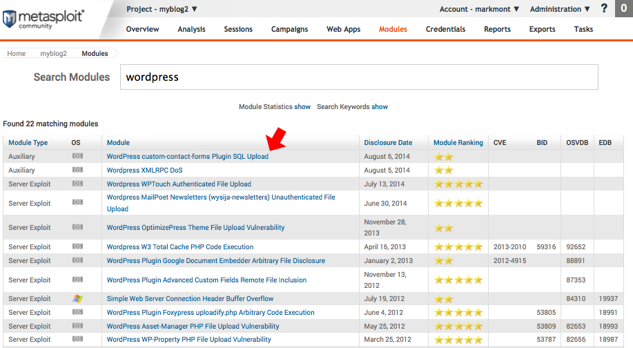 List of Metasploit WordPress exploit modules: