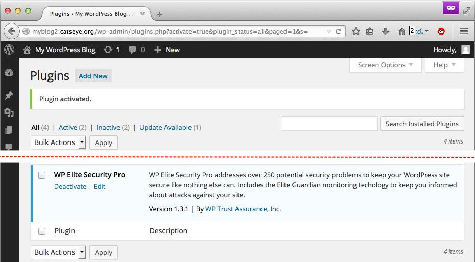 Zip up our wp-elite-security plugin, upload it, and activate it: