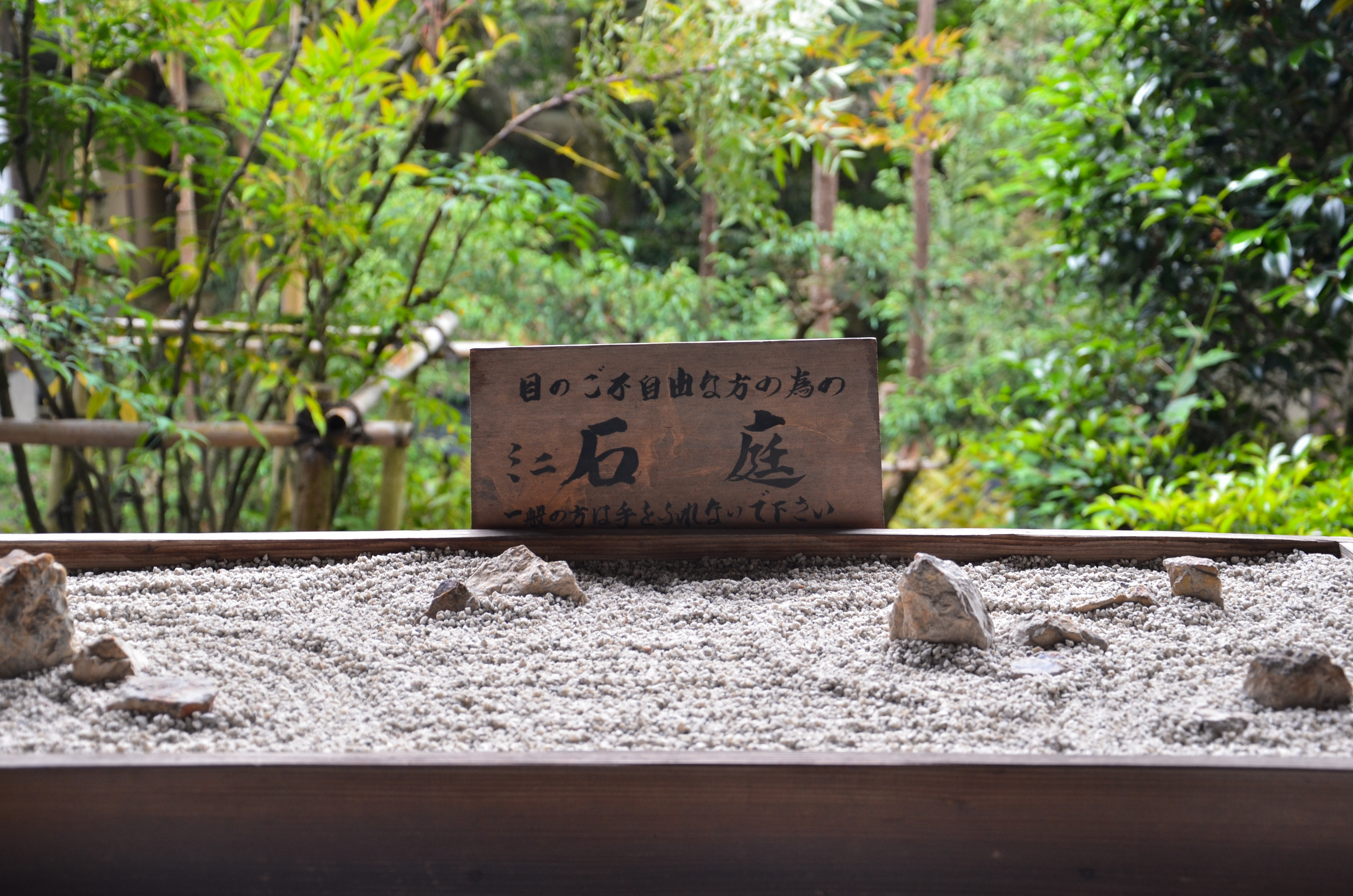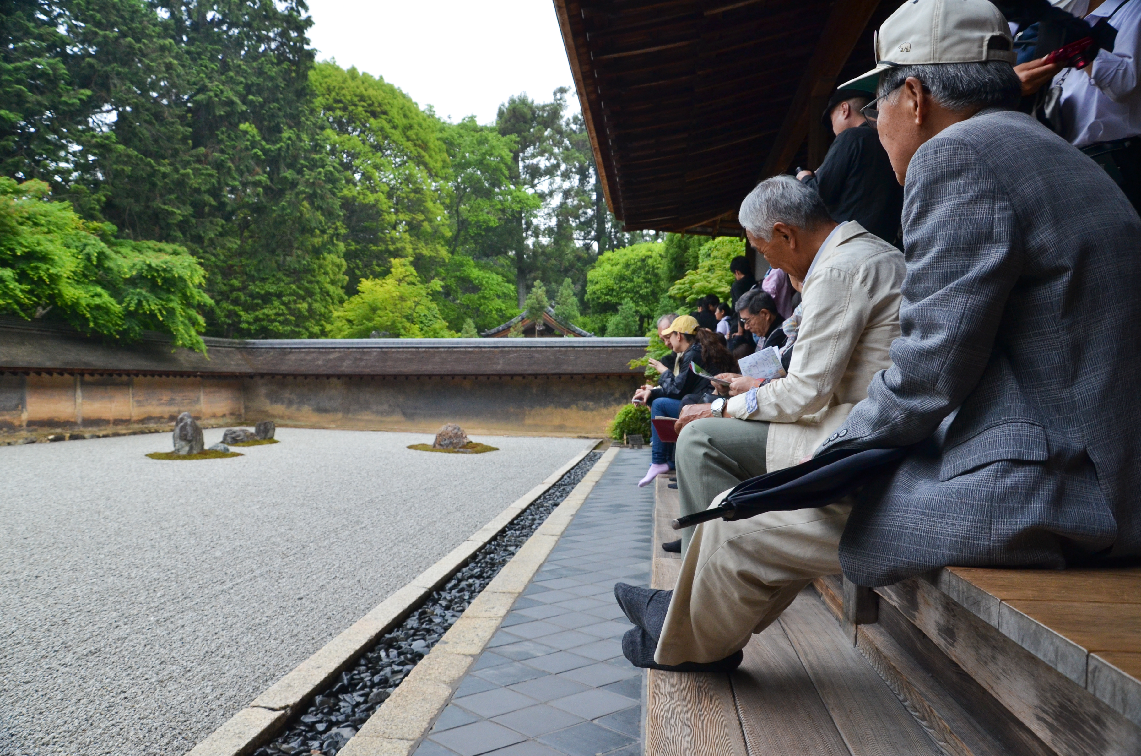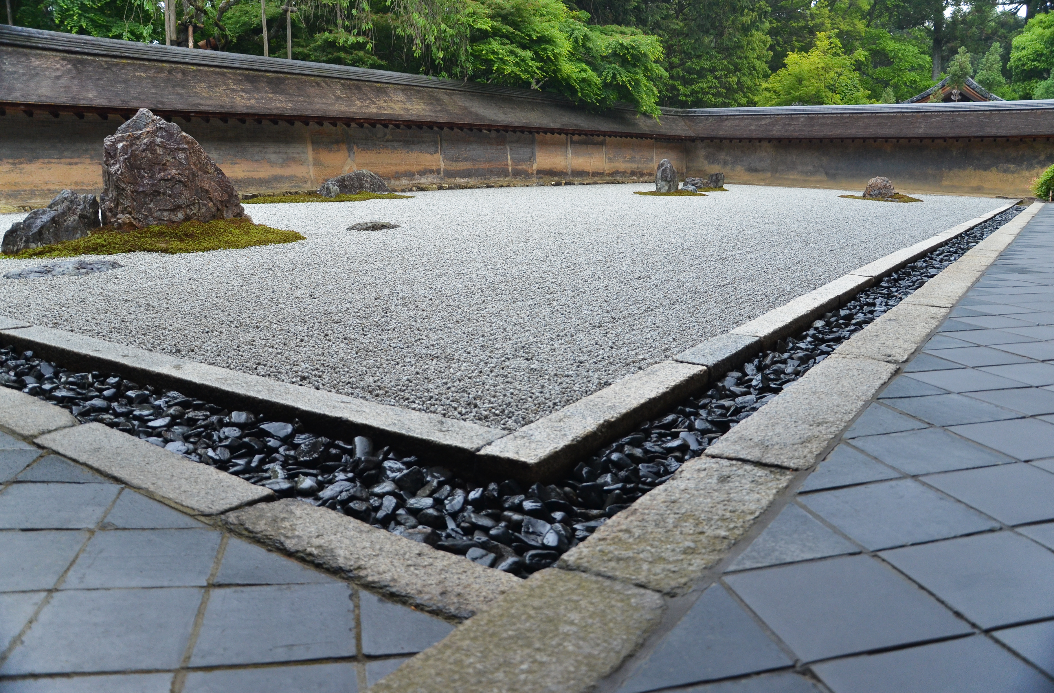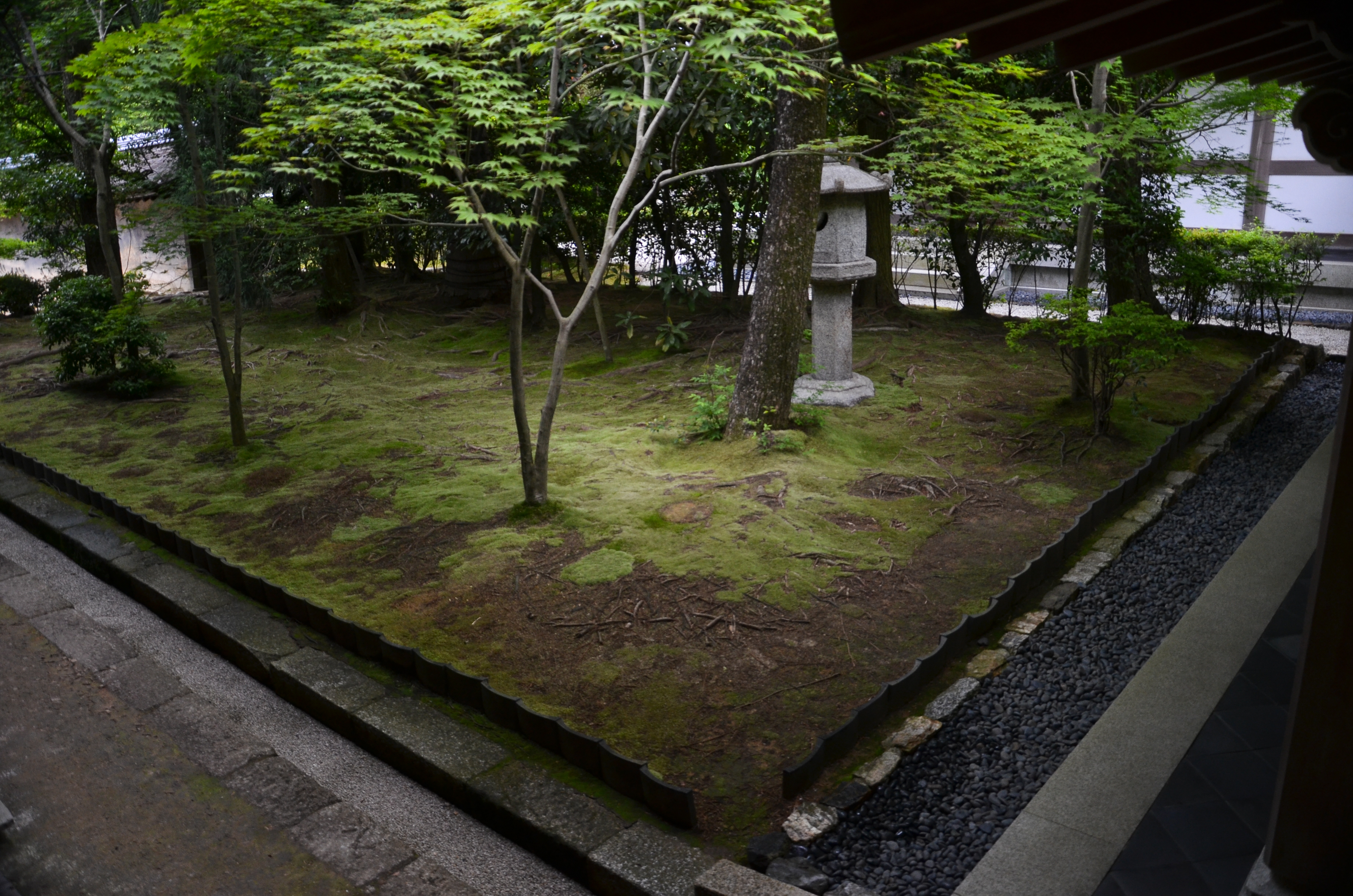 The temple itself was dark inside; the majority of light came from the long opening to the rock garden. The temple had a very long step where people could sit before the garden and contemplate its design. The light drizzle that was going on also helped add to the mood. An ideal place for spending time in solitude on a less-crowded day.