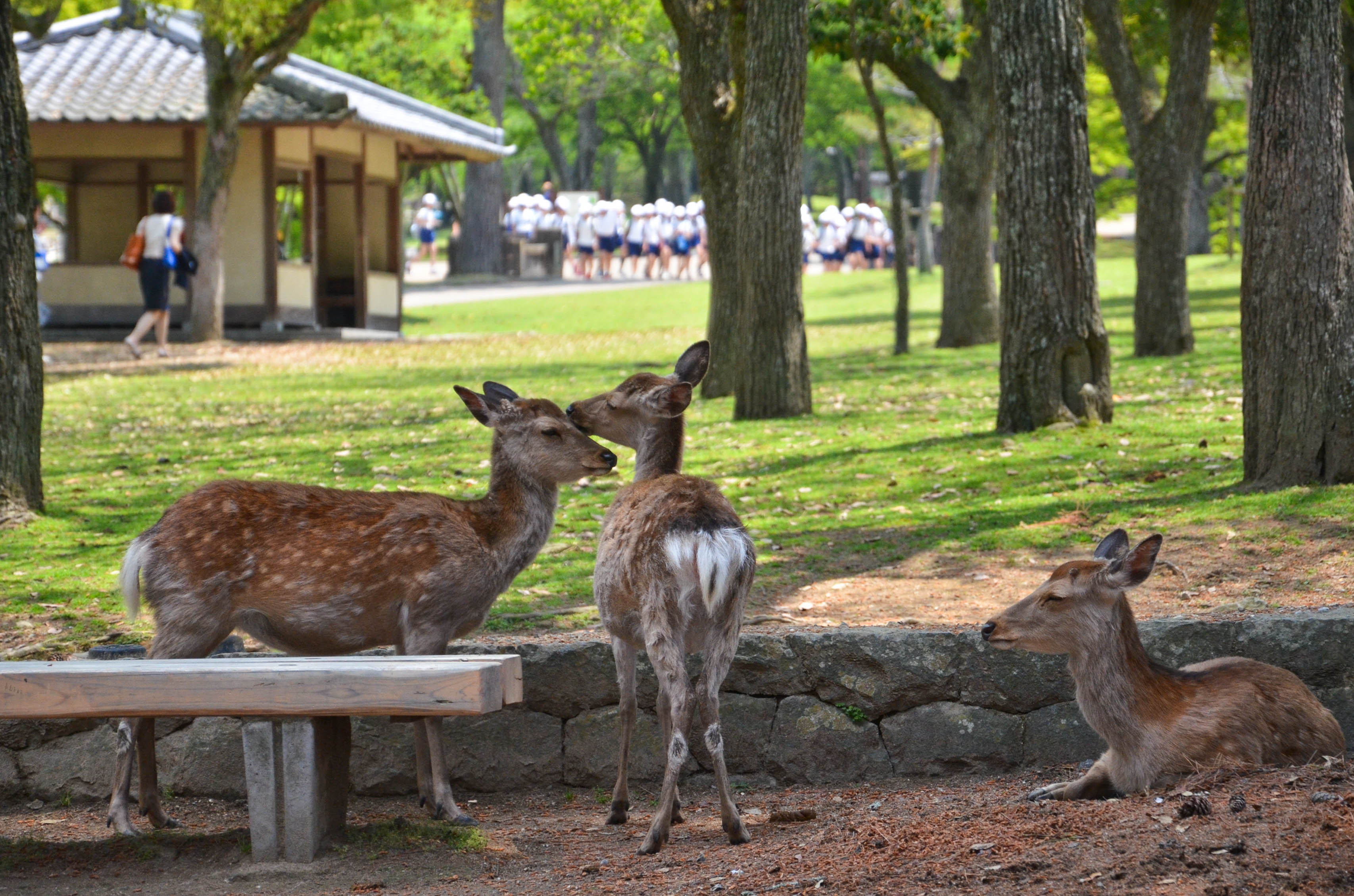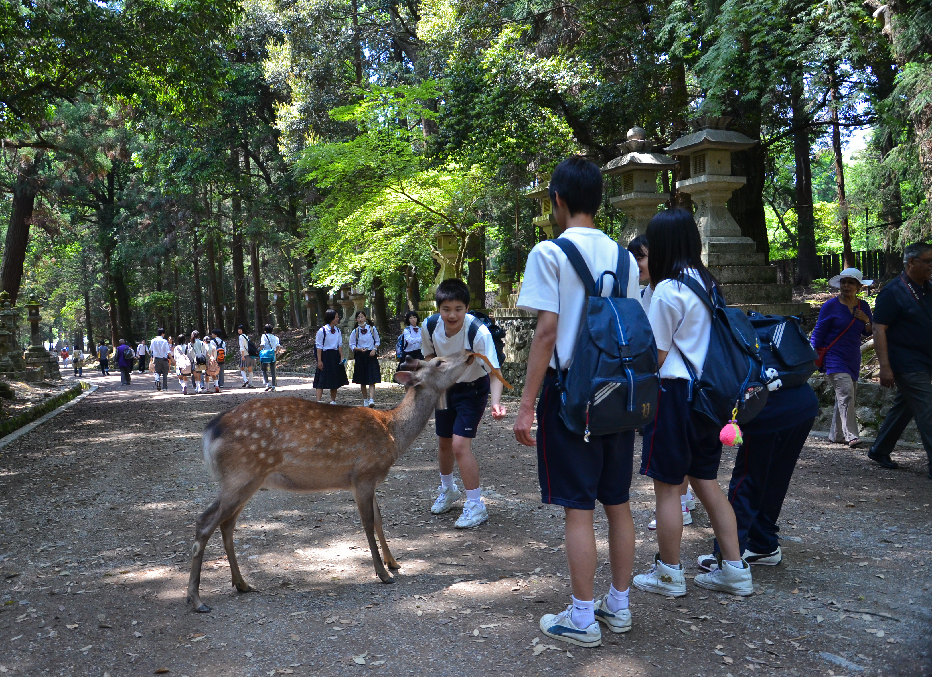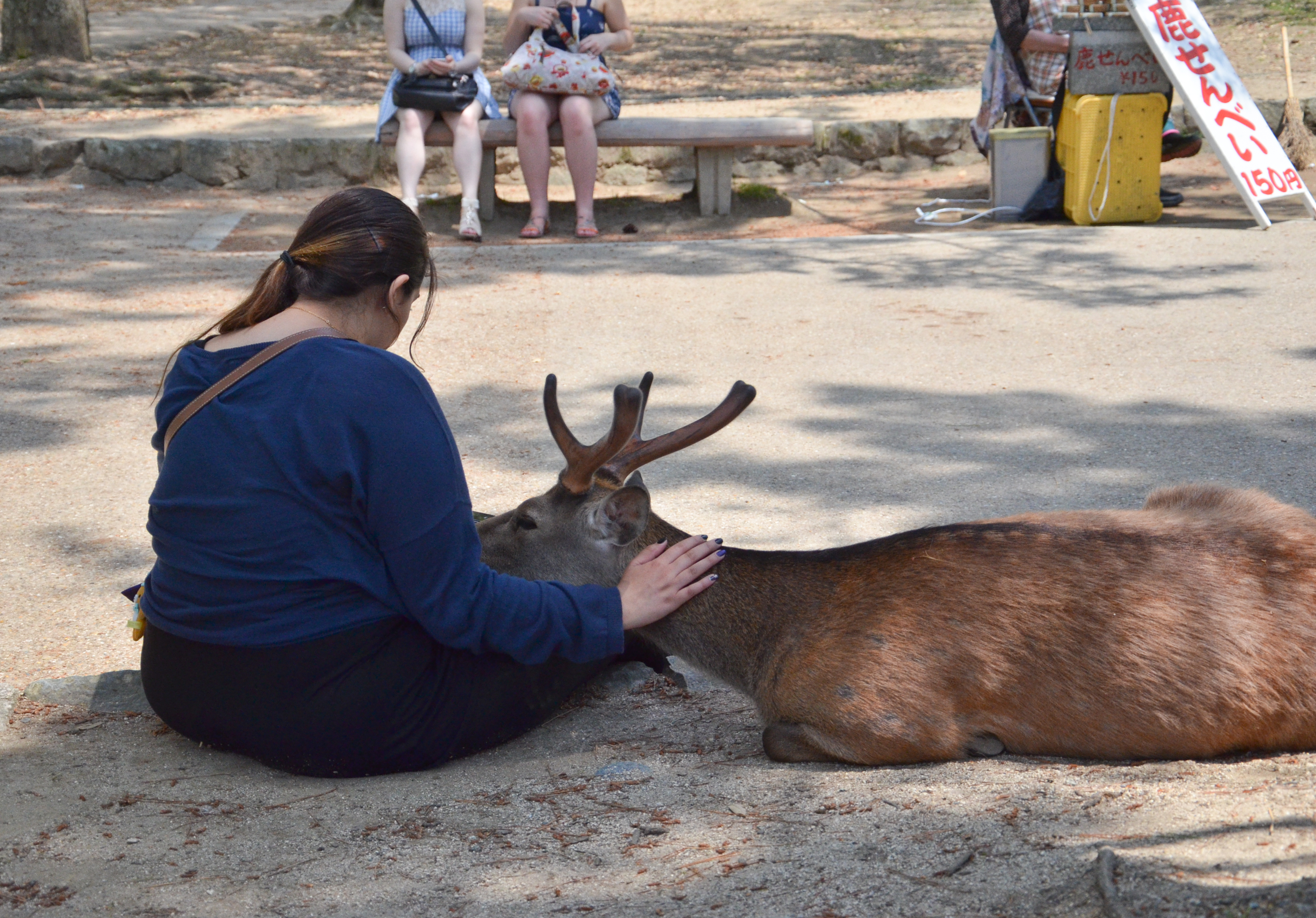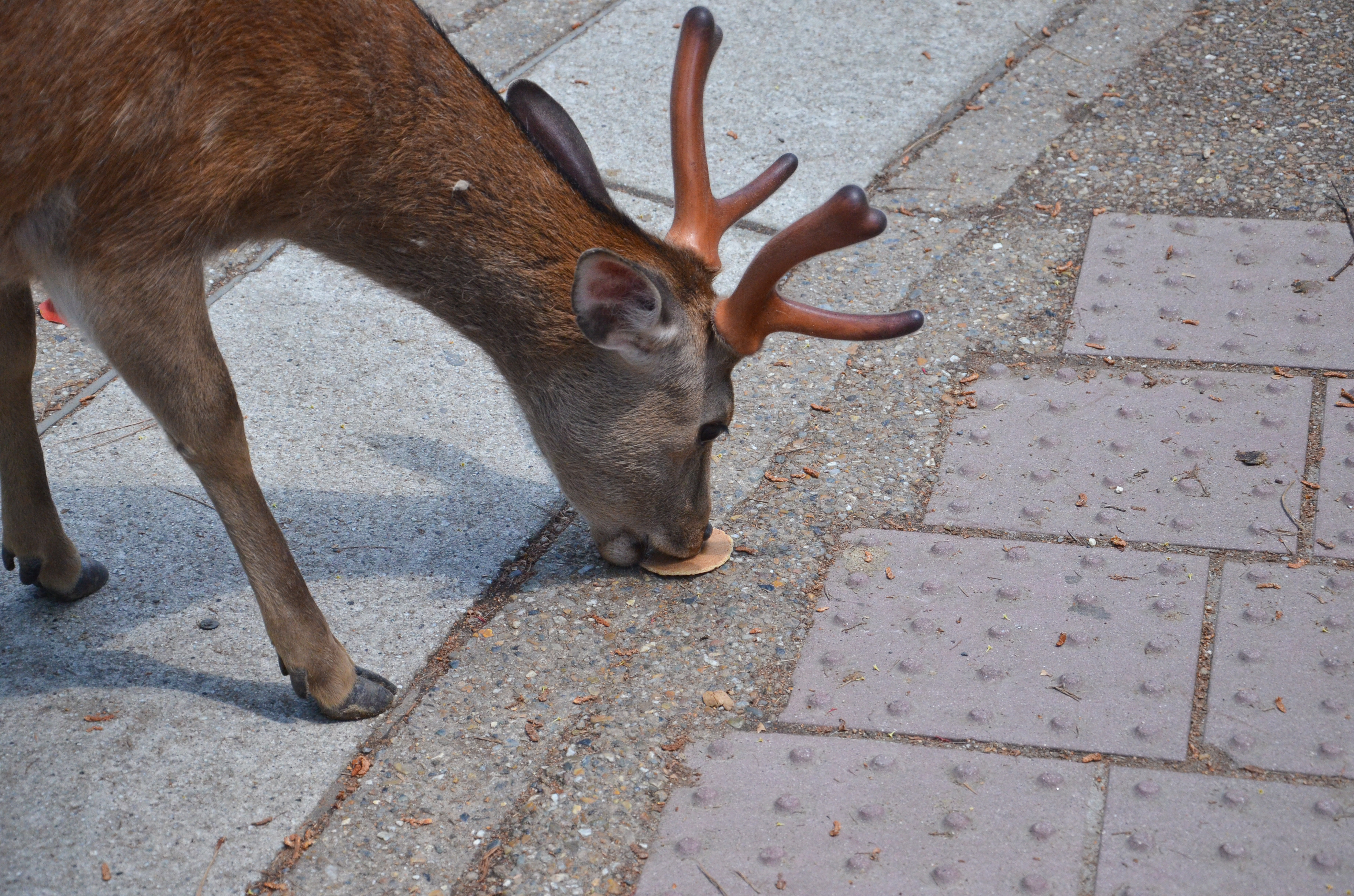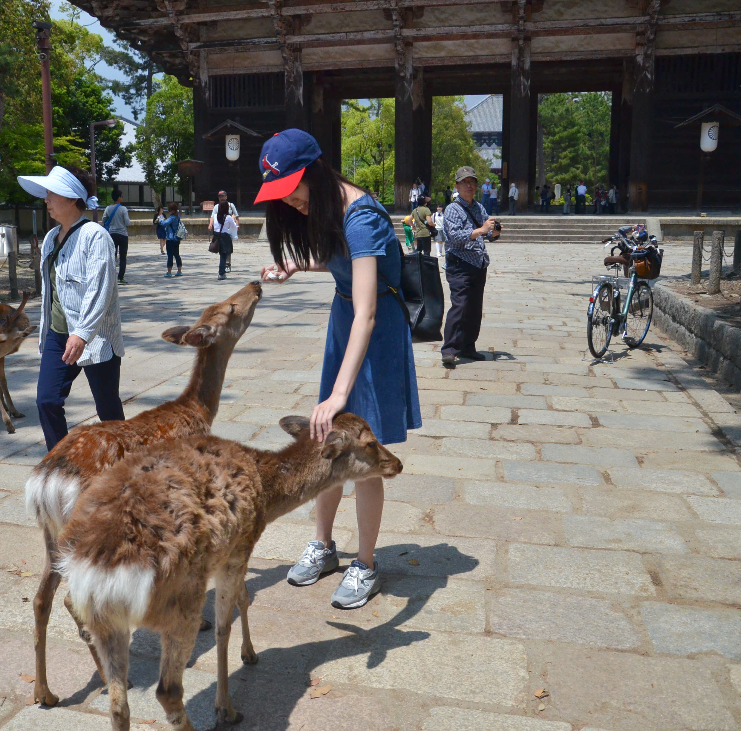 When we went back out through the gates, I finally decided to try my own hand with feeding the deer! Fortunately, most of the deer were lying down in the shade, but there were still a few hungry individuals. Feeding them was actually quite fun, despite getting nipped once and having to nudge them backwards. I also suddenly remembered that someone had made the deer bow before giving them a cookie, so I tried it out. It worked! We bowed to each other multiple times, and I gave them a piece of cookie each time. :)