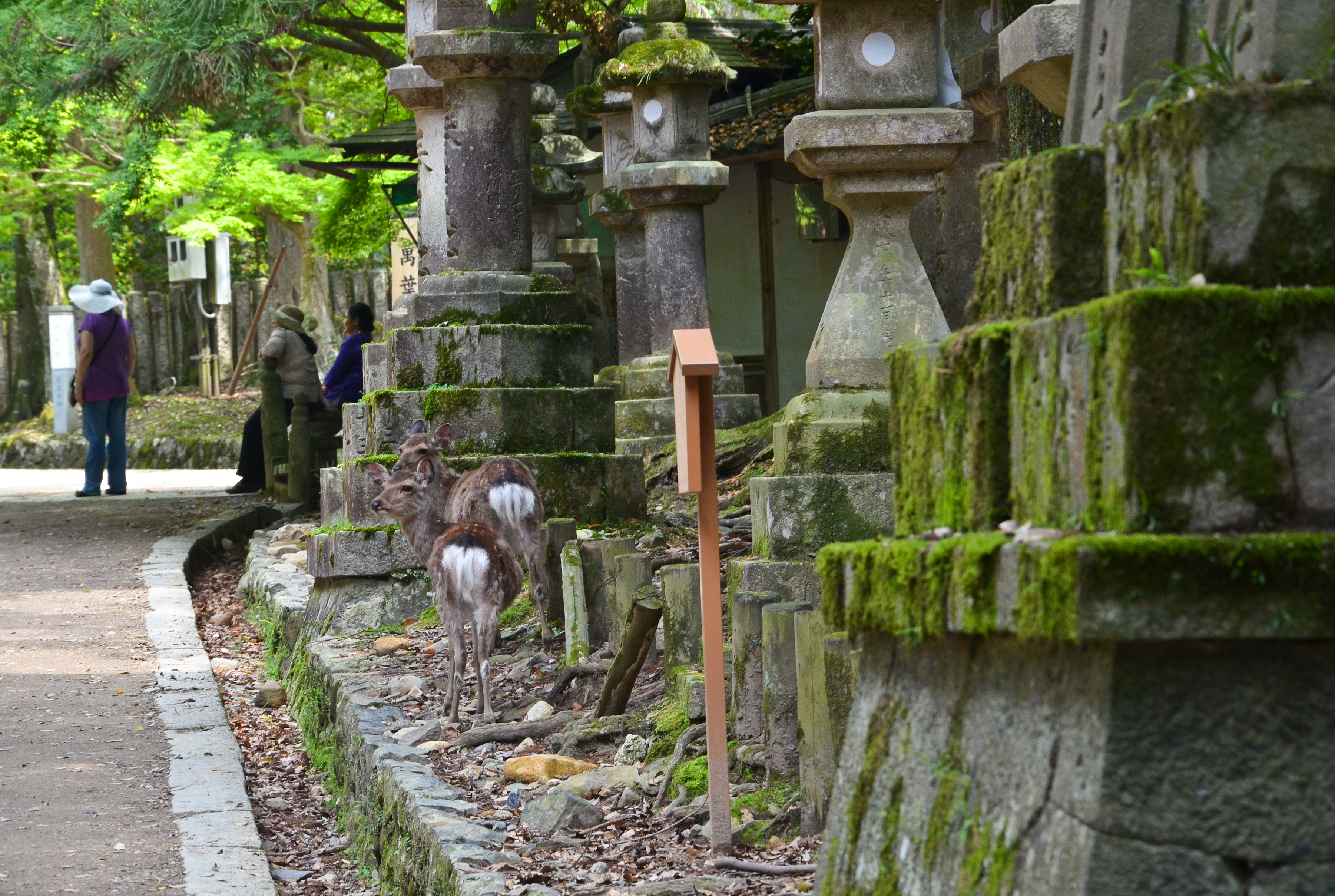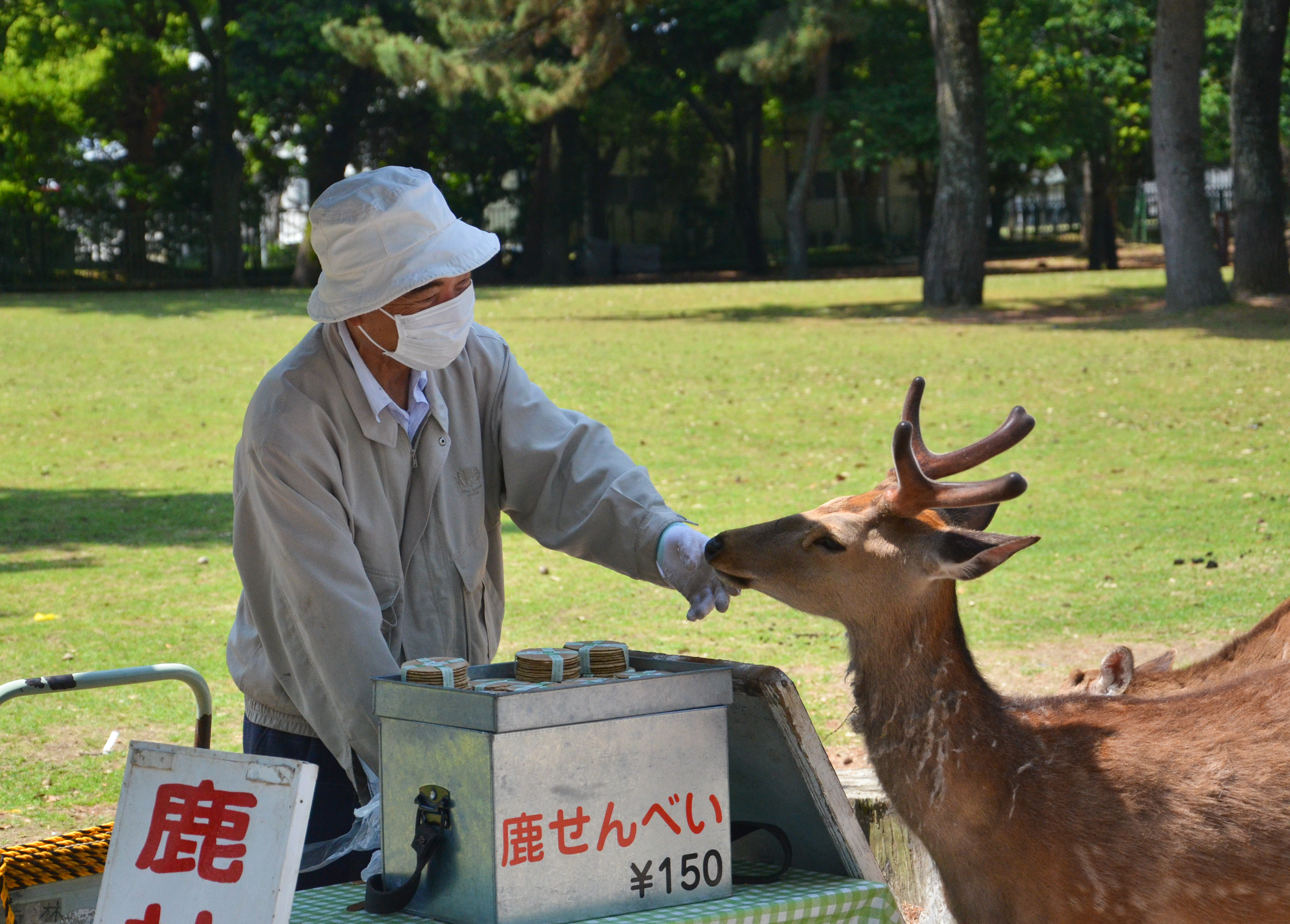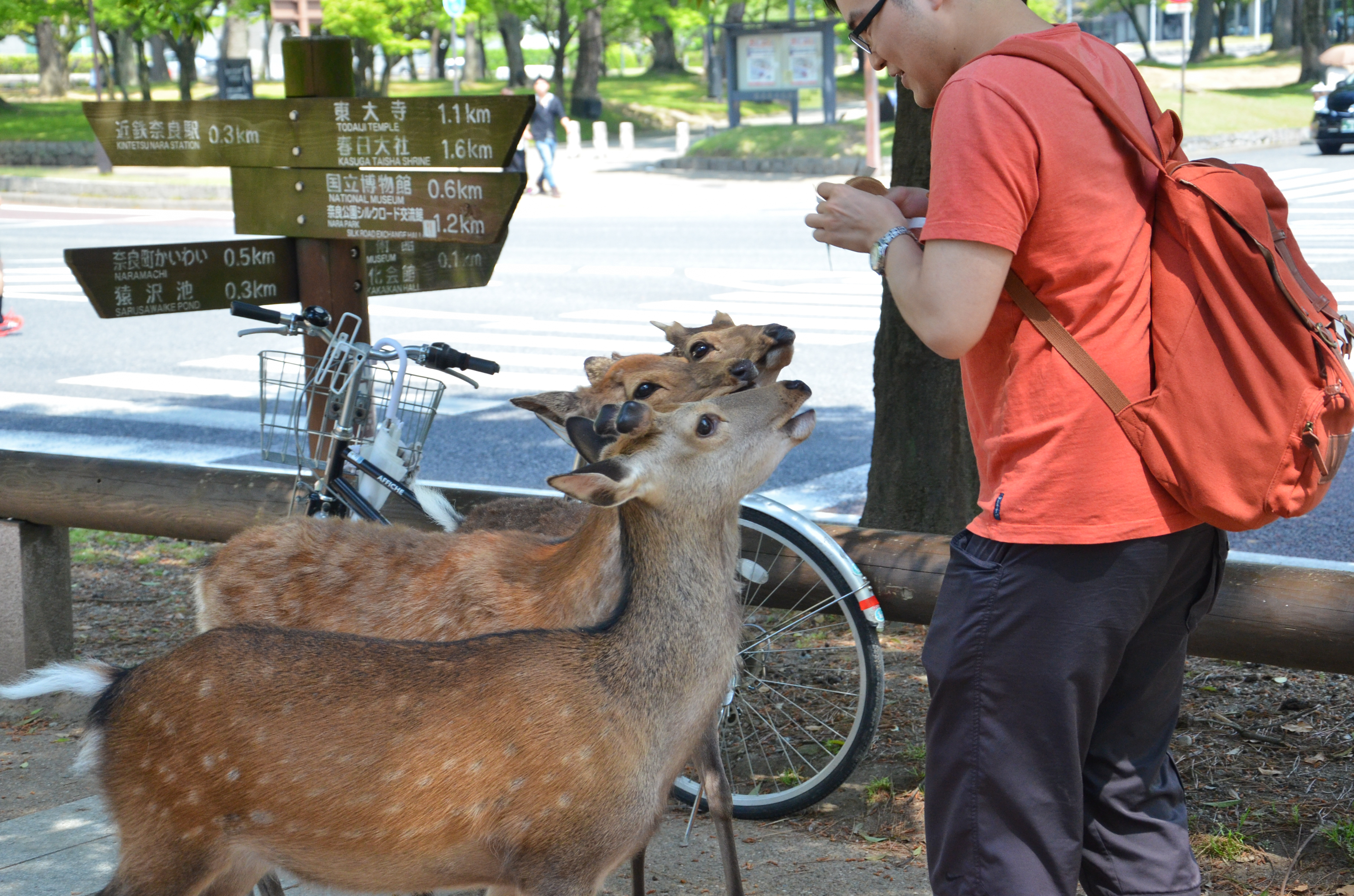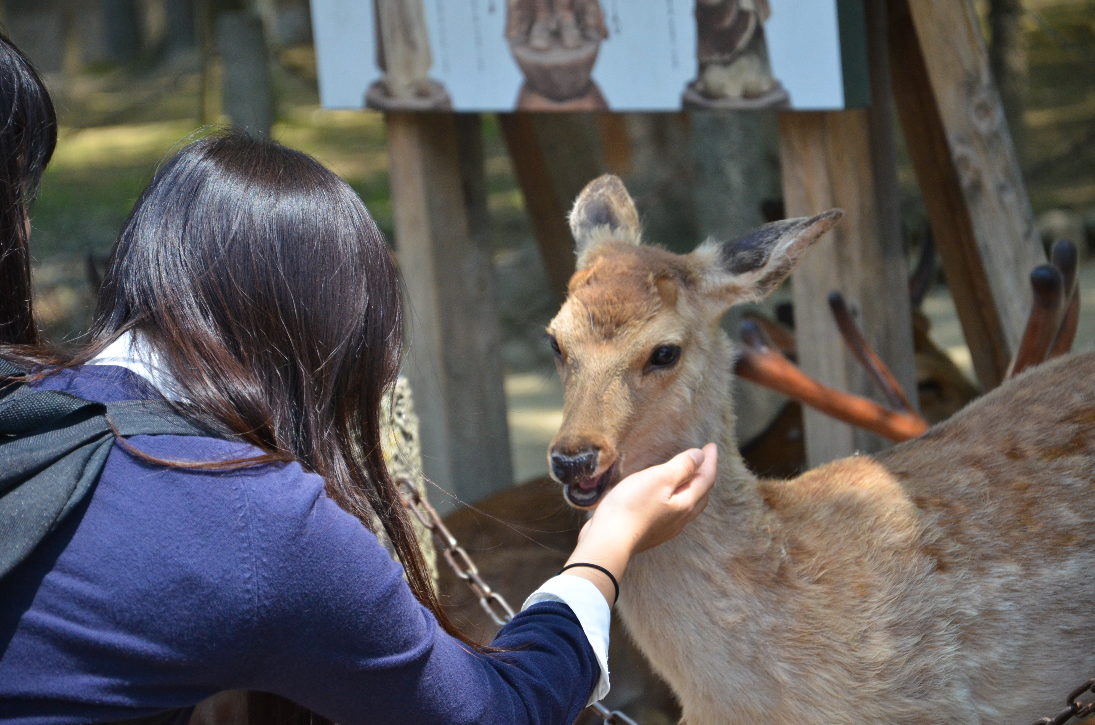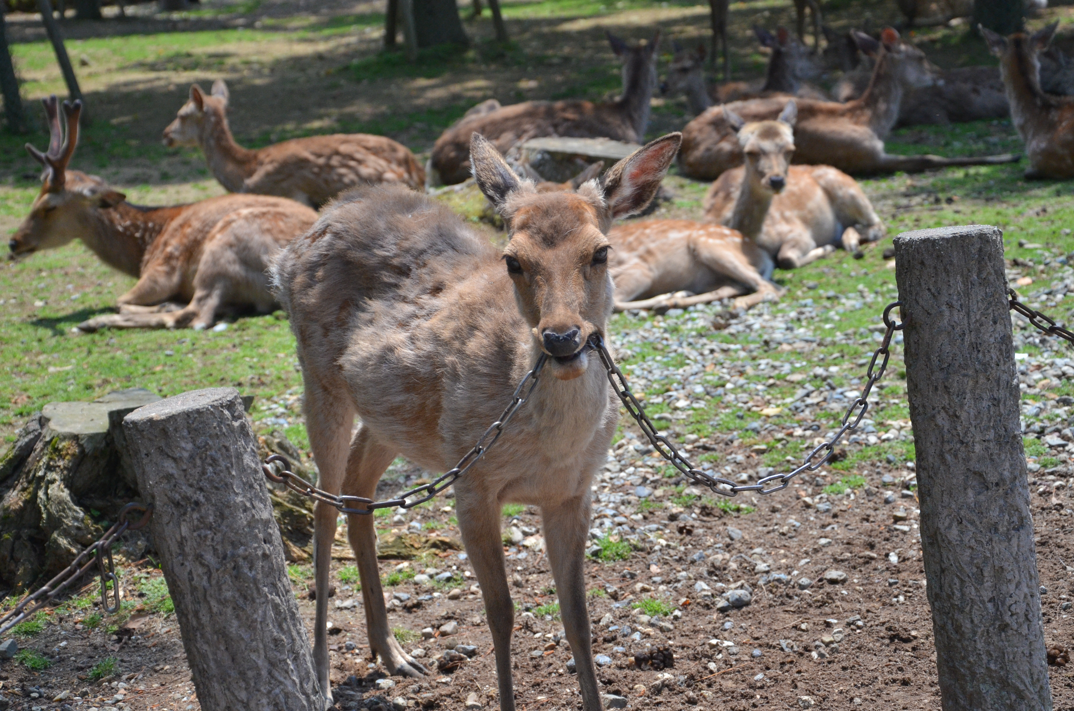 When we went back out through the gates, I finally decided to try my own hand with feeding the deer! Fortunately, most of the deer were lying down in the shade, but there were still a few hungry individuals. Feeding them was actually quite fun, despite getting nipped once and having to nudge them backwards. I also suddenly remembered that someone had made the deer bow before giving them a cookie, so I tried it out. It worked! We bowed to each other multiple times, and I gave them a piece of cookie each time. :)