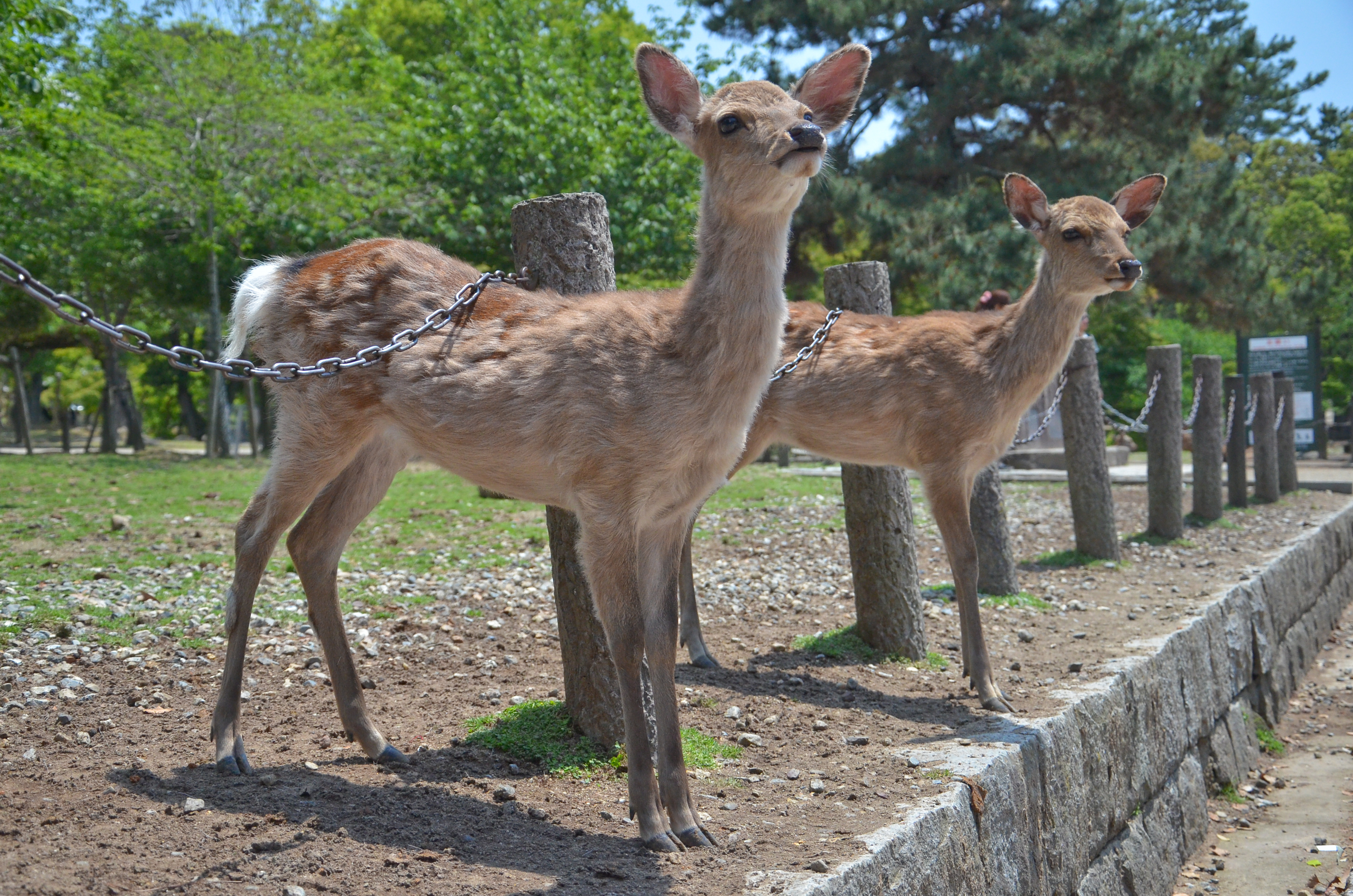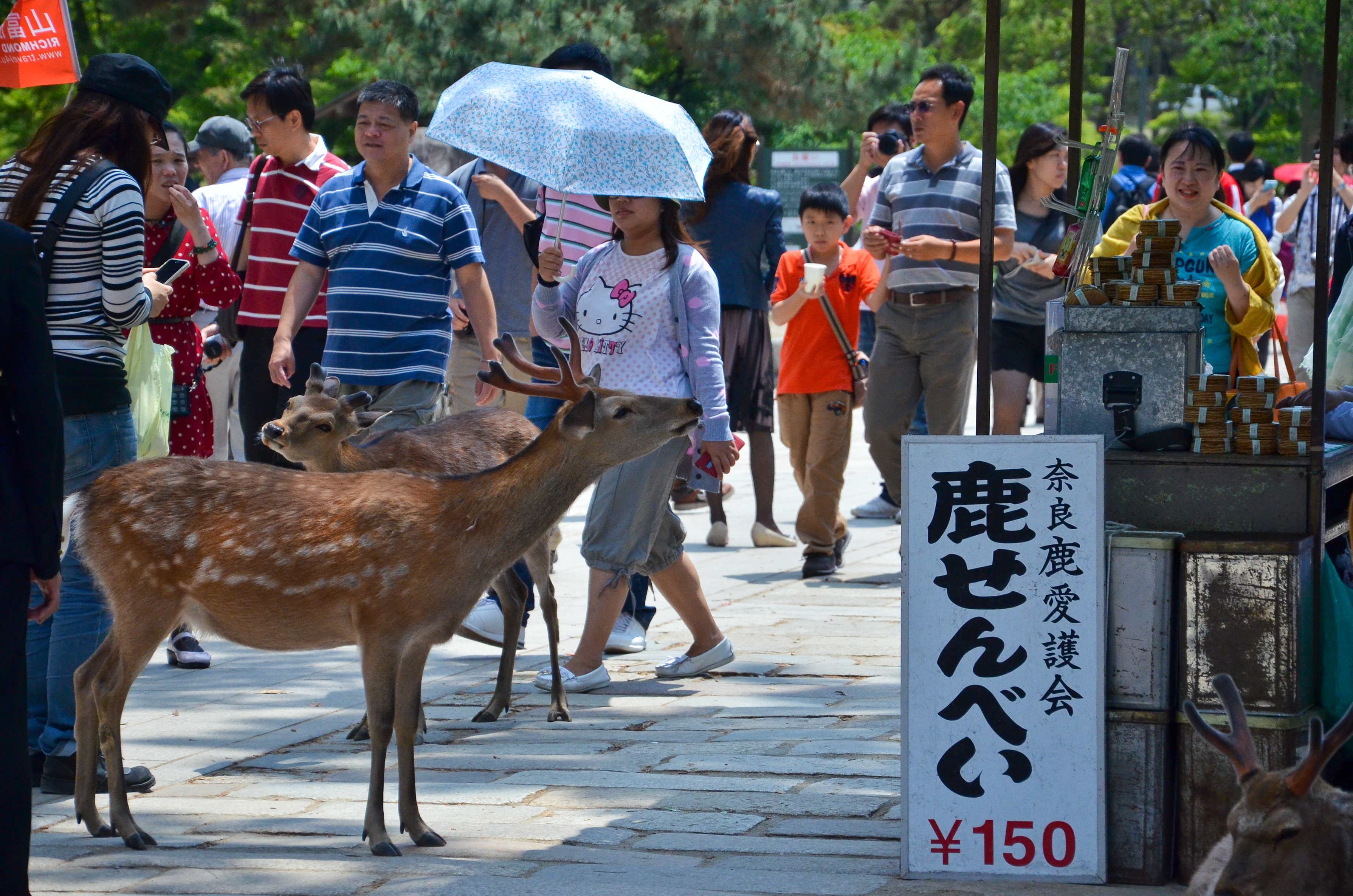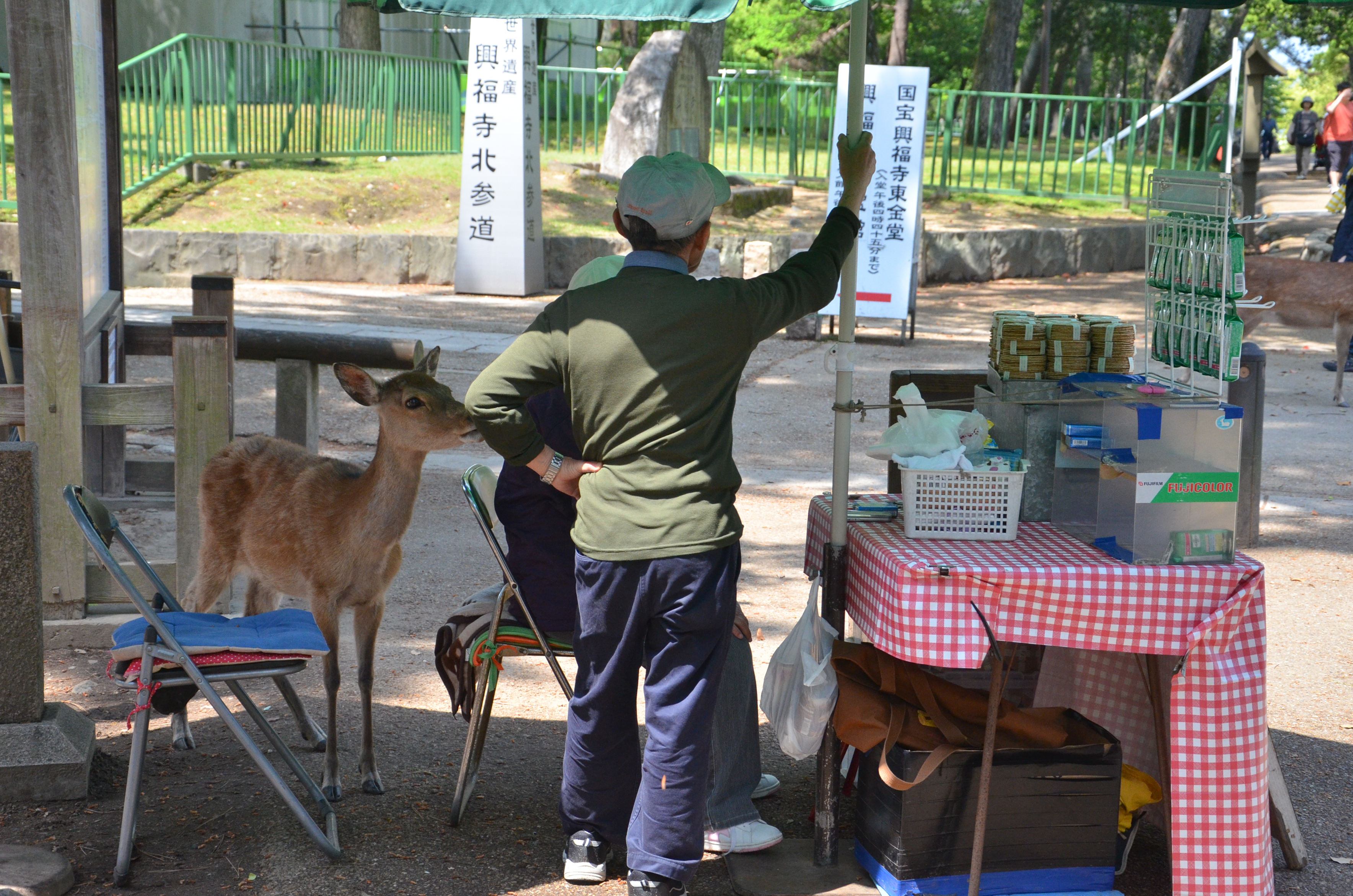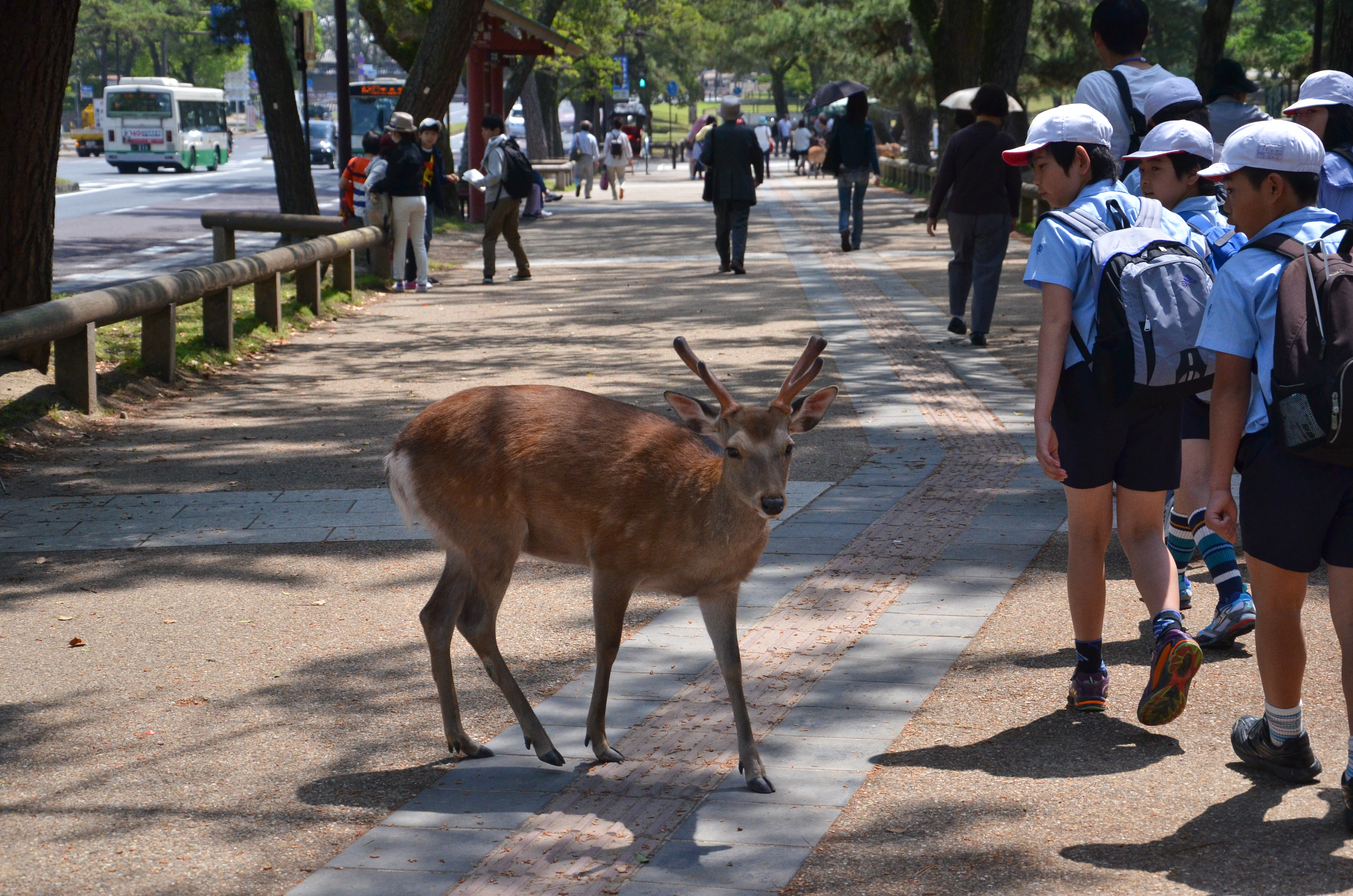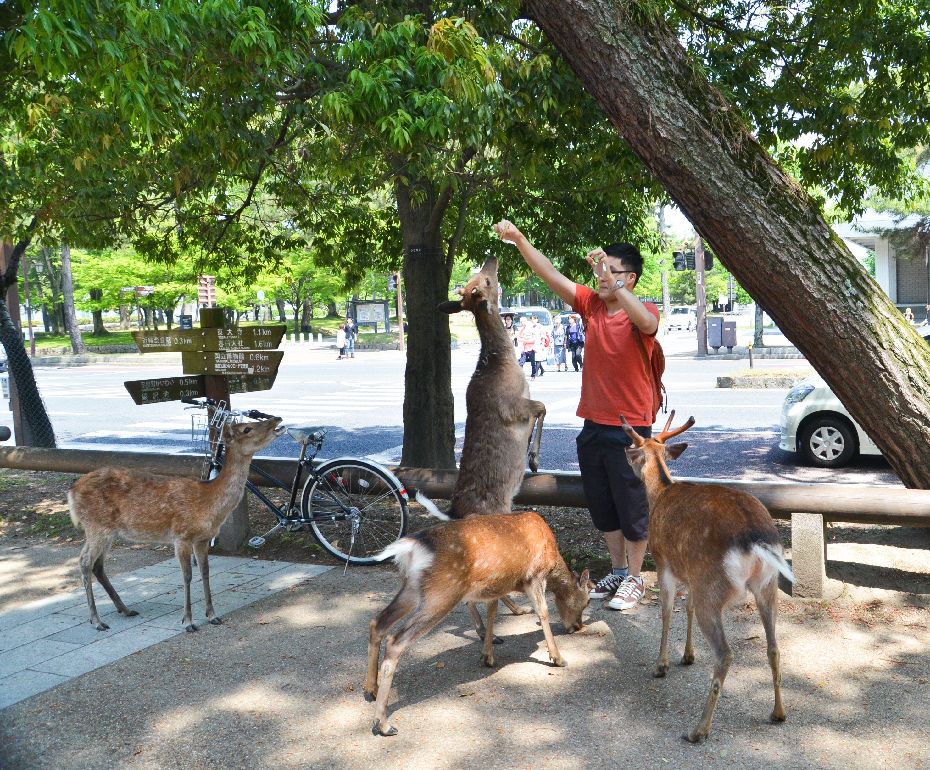When we went back out through the gates, I finally decided to try my own hand with feeding the deer! Fortunately, most of the deer were lying down in the shade, but there were still a few hungry individuals. Feeding them was actually quite fun, despite getting nipped once and having to nudge them backwards. I also suddenly remembered that someone had made the deer bow before giving them a cookie, so I tried it out. It worked! We bowed to each other multiple times, and I gave them a piece of cookie each time. :)