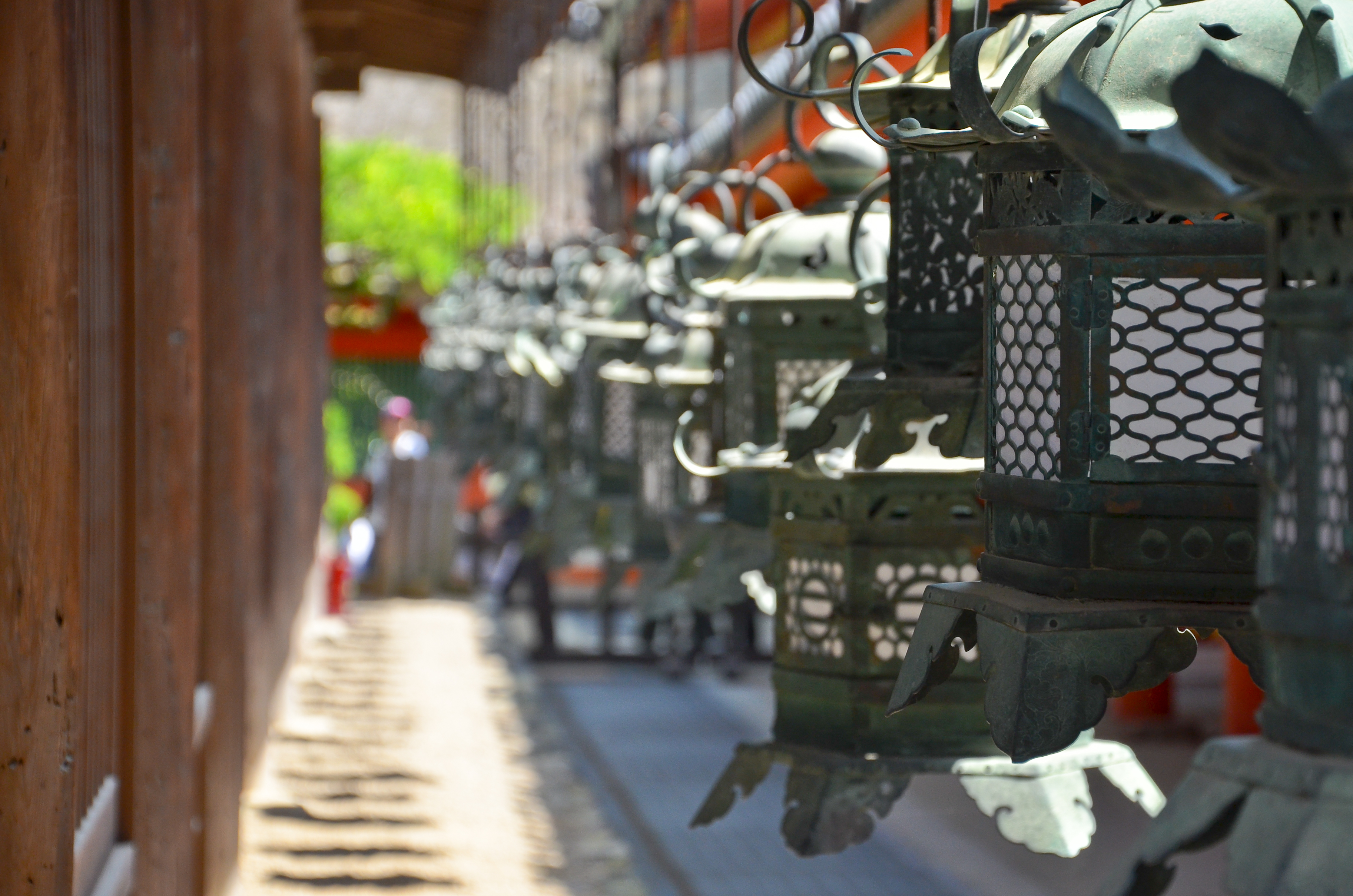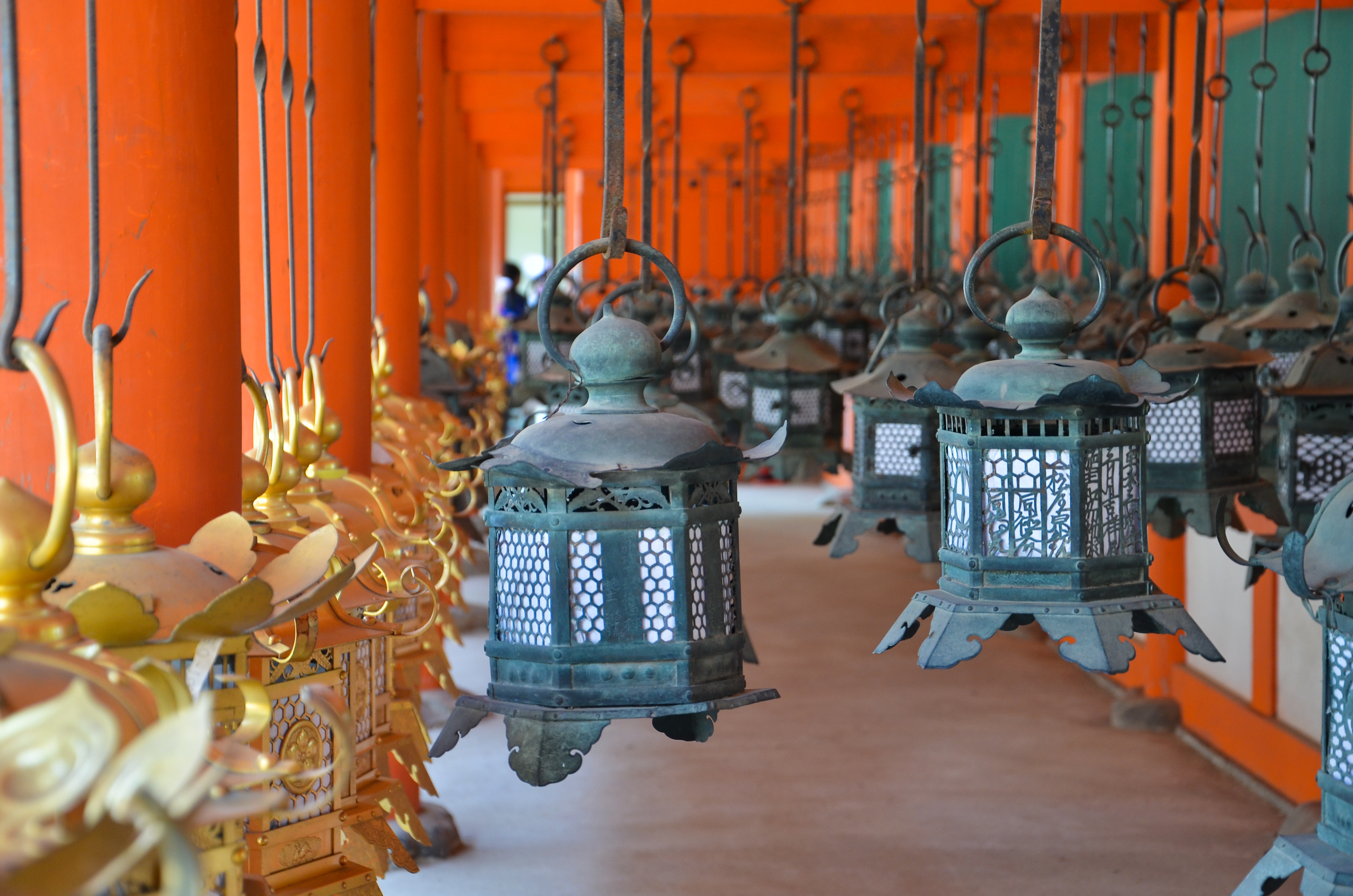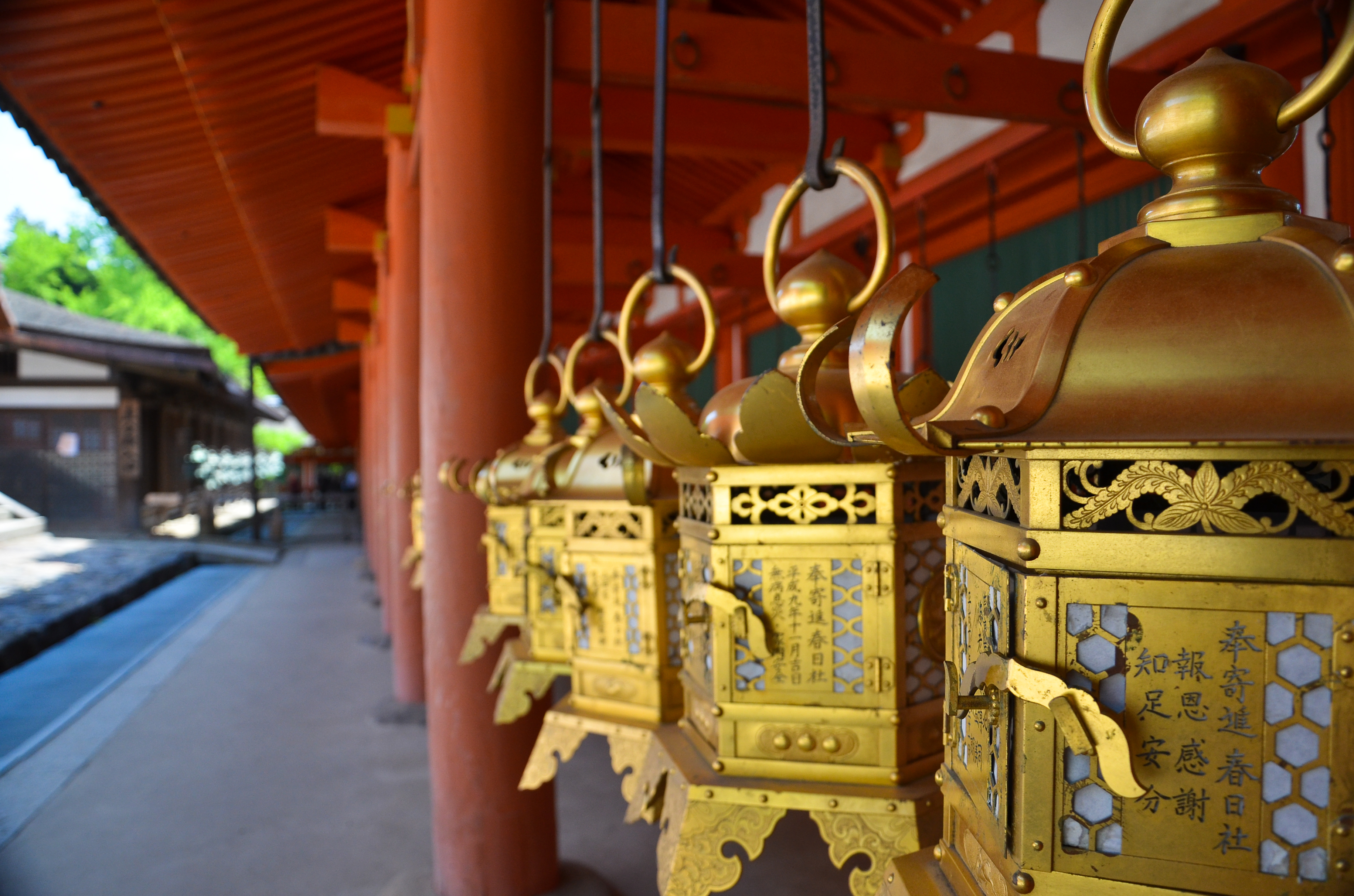 We finally made it to the top where Kasuga Taisha was, but my mom and grandma wanted to sit and rest, so I went in by myself. There were only a couple people inside the small grounds, so it was very quiet, even if there were a lot of people milling around near the entrance. These people also left soon after I came in, so I was now alone. The exterior hallways were all lined with rows of gorgeous metal and golden hanging lanterns. The breeze made a soft whistling noise as it blew through them, but none of them moved.