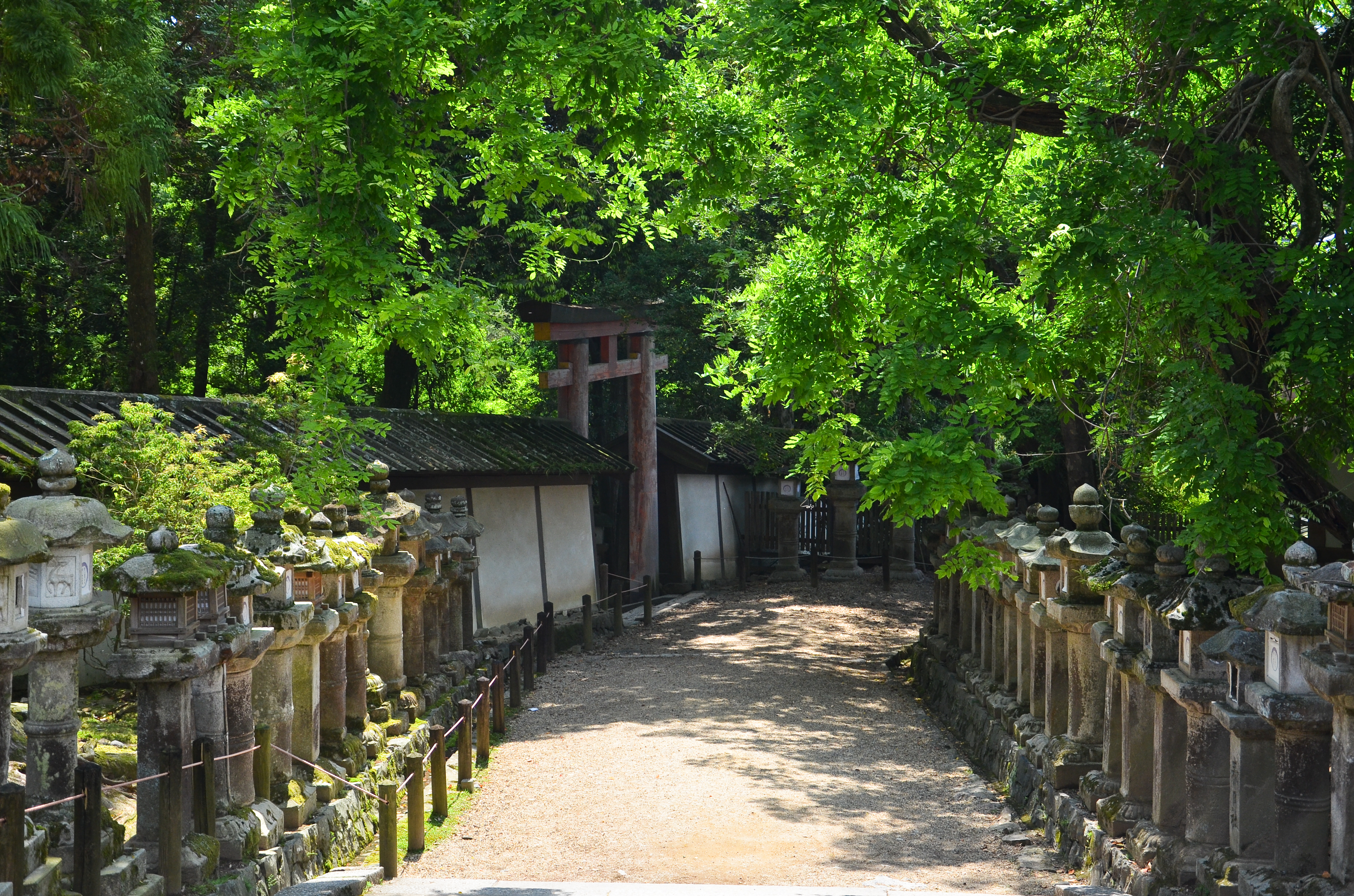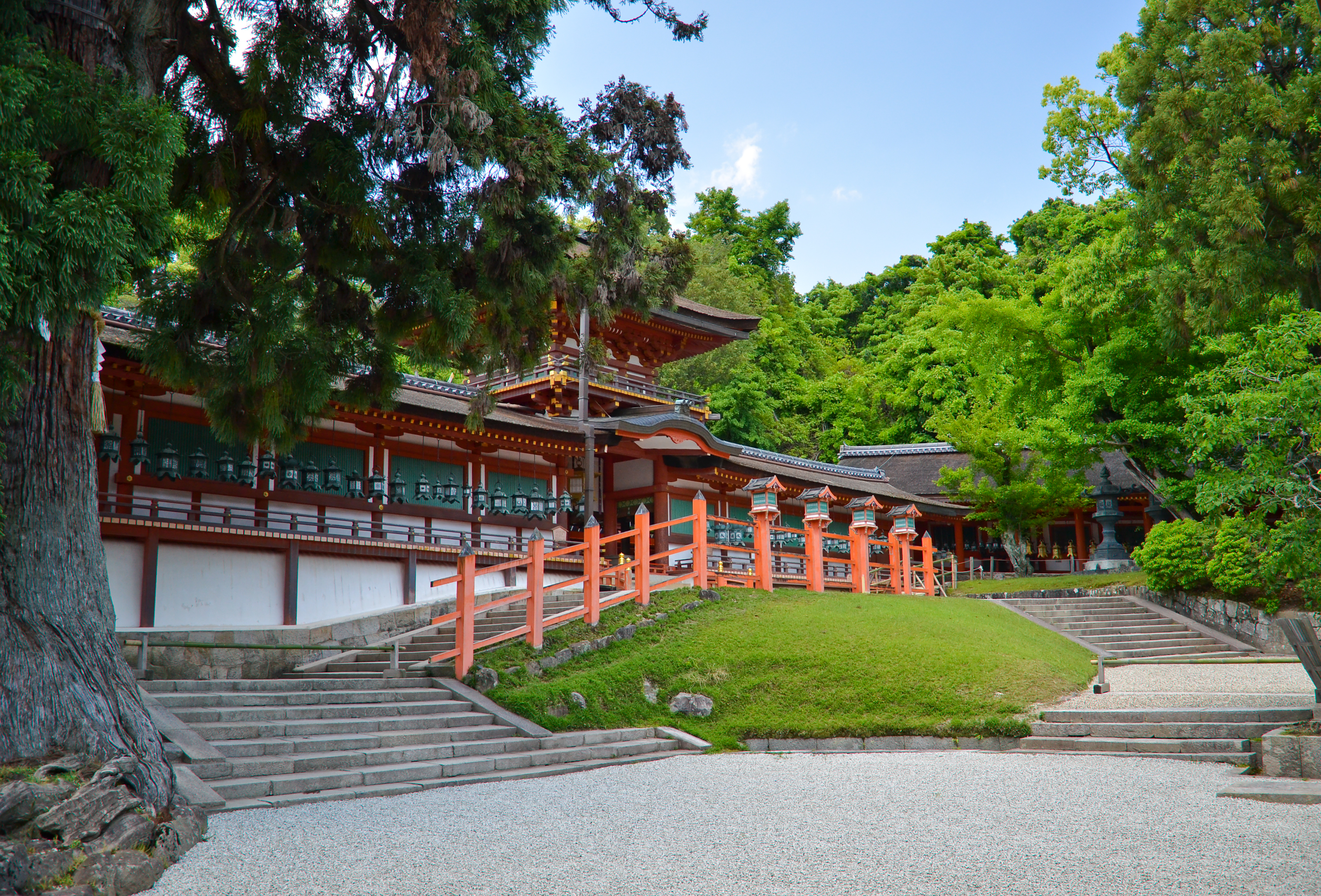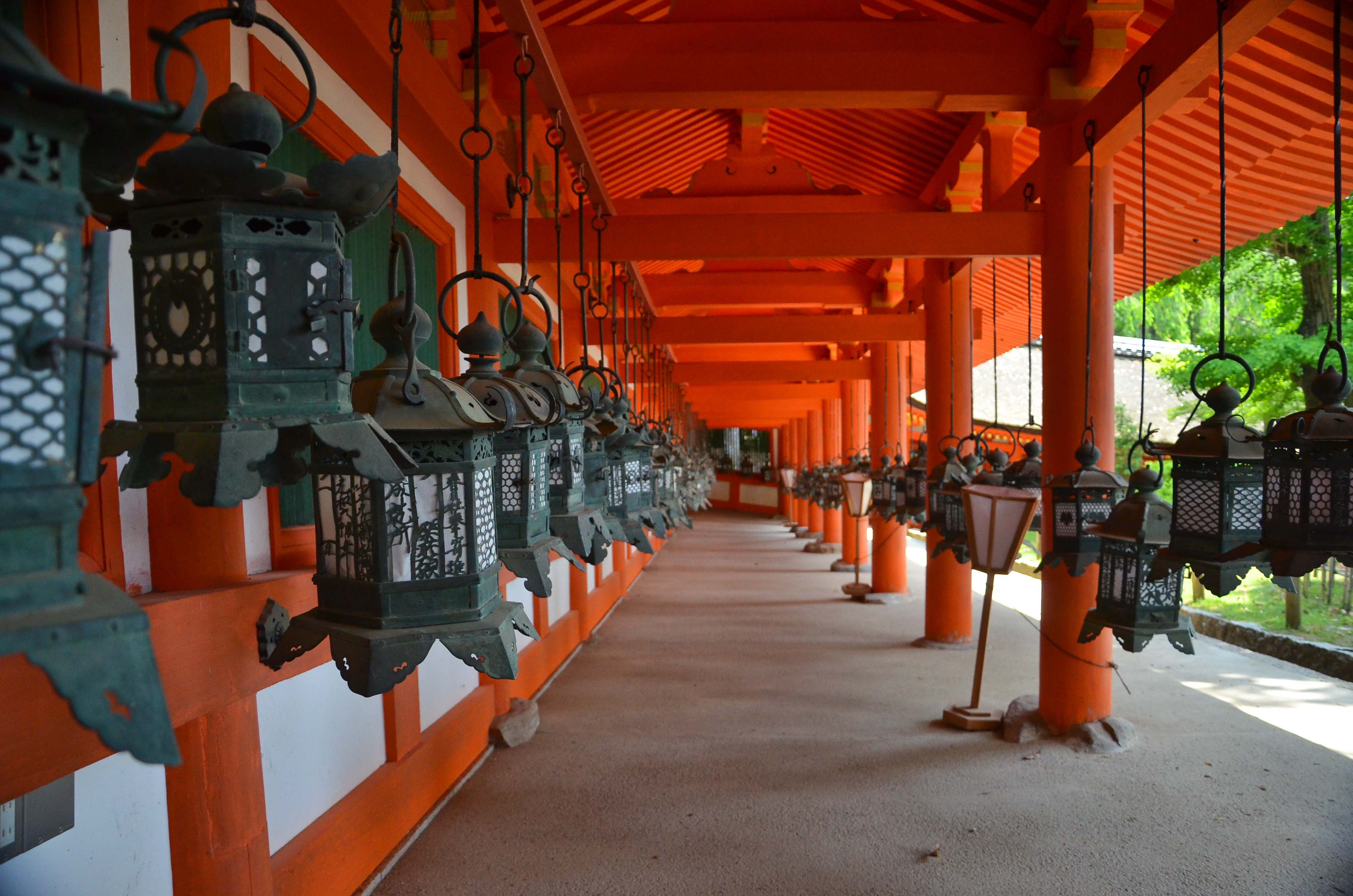 We finally made it to the top where Kasuga Taisha was, but my mom and grandma wanted to sit and rest, so I went in by myself. There were only a couple people inside the small grounds, so it was very quiet, even if there were a lot of people milling around near the entrance. These people also left soon after I came in, so I was now alone. The exterior hallways were all lined with rows of gorgeous metal and golden hanging lanterns. The breeze made a soft whistling noise as it blew through them, but none of them moved.