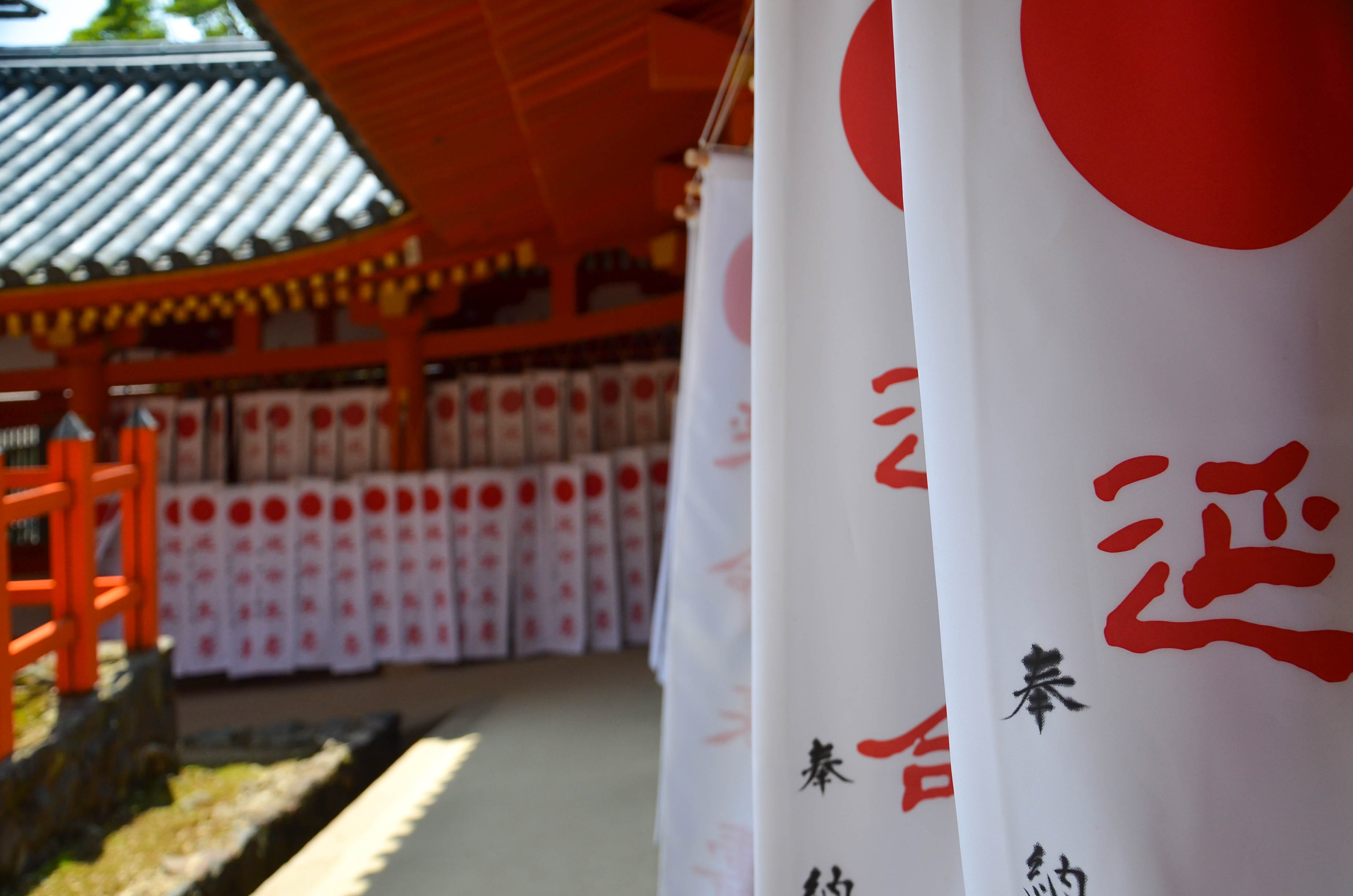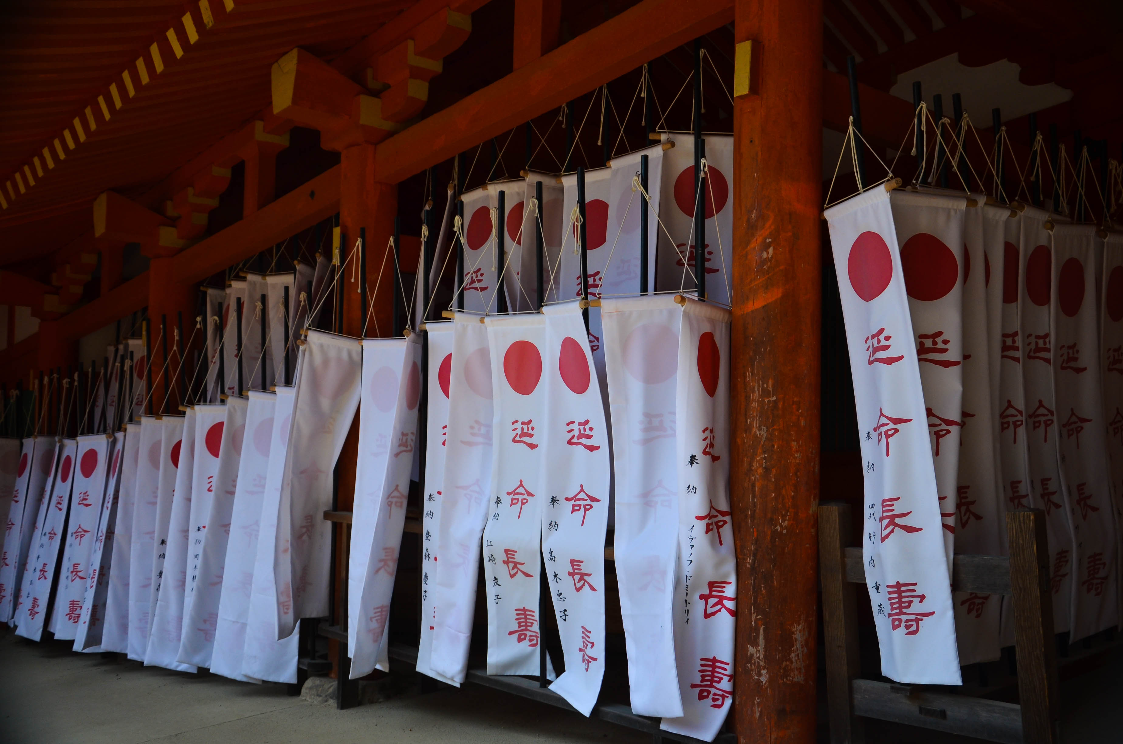 On the other side, the hall was covered in long, white banners with red writing. They fluttered gently in the breeze, making a deep, flowing sound. I couldn't help standing around for a while, listening and watching them.