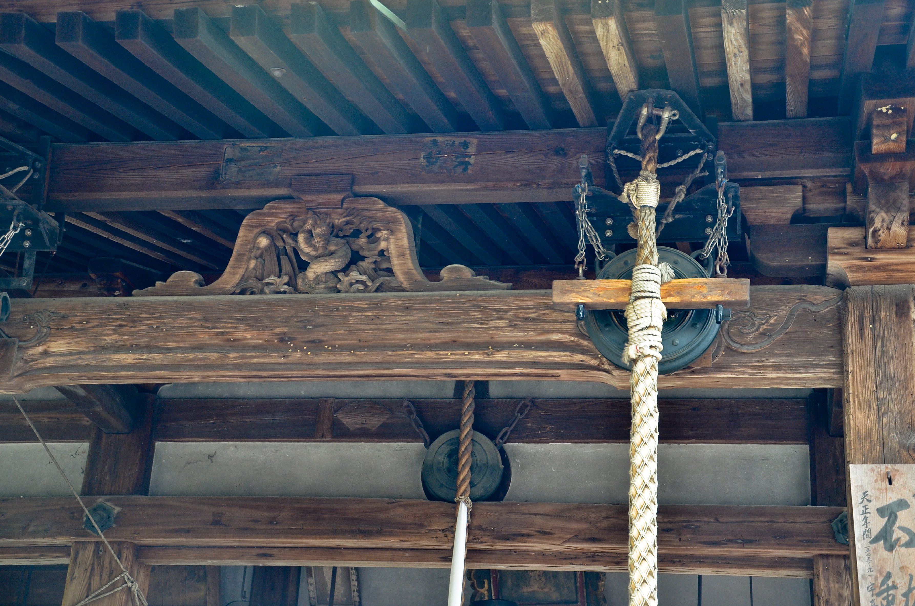 The wooden block would hit the metal plate whenever someone pulled the rope, making a deep, ringing noise