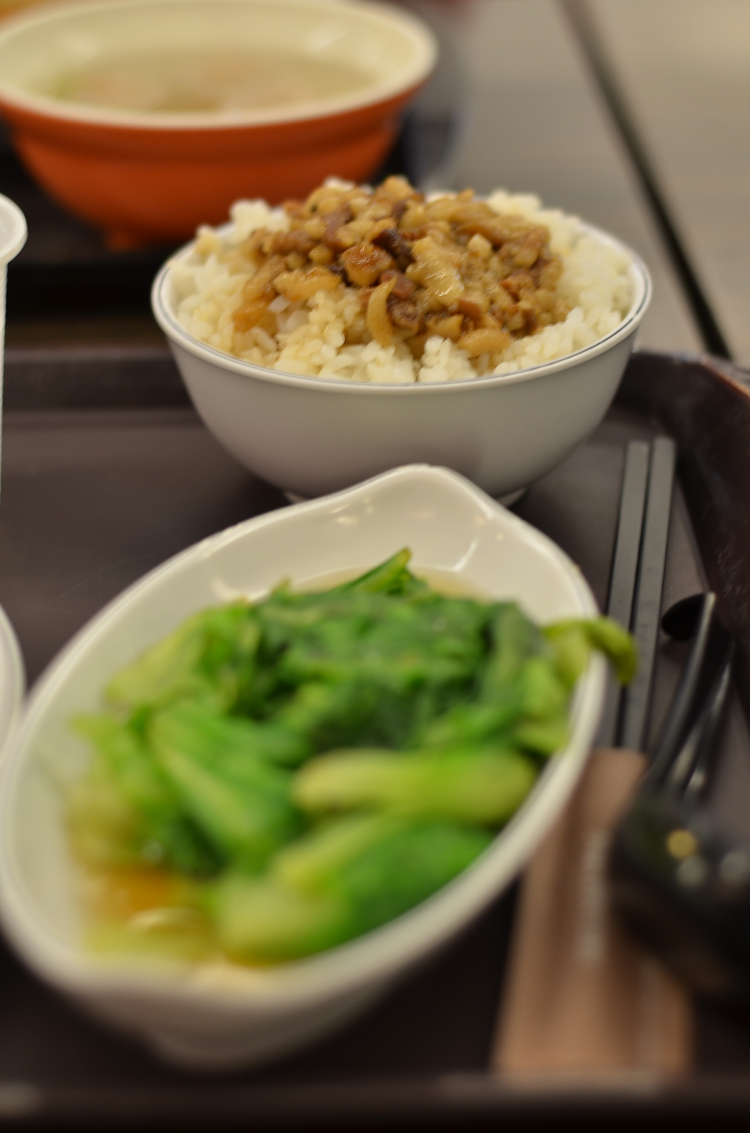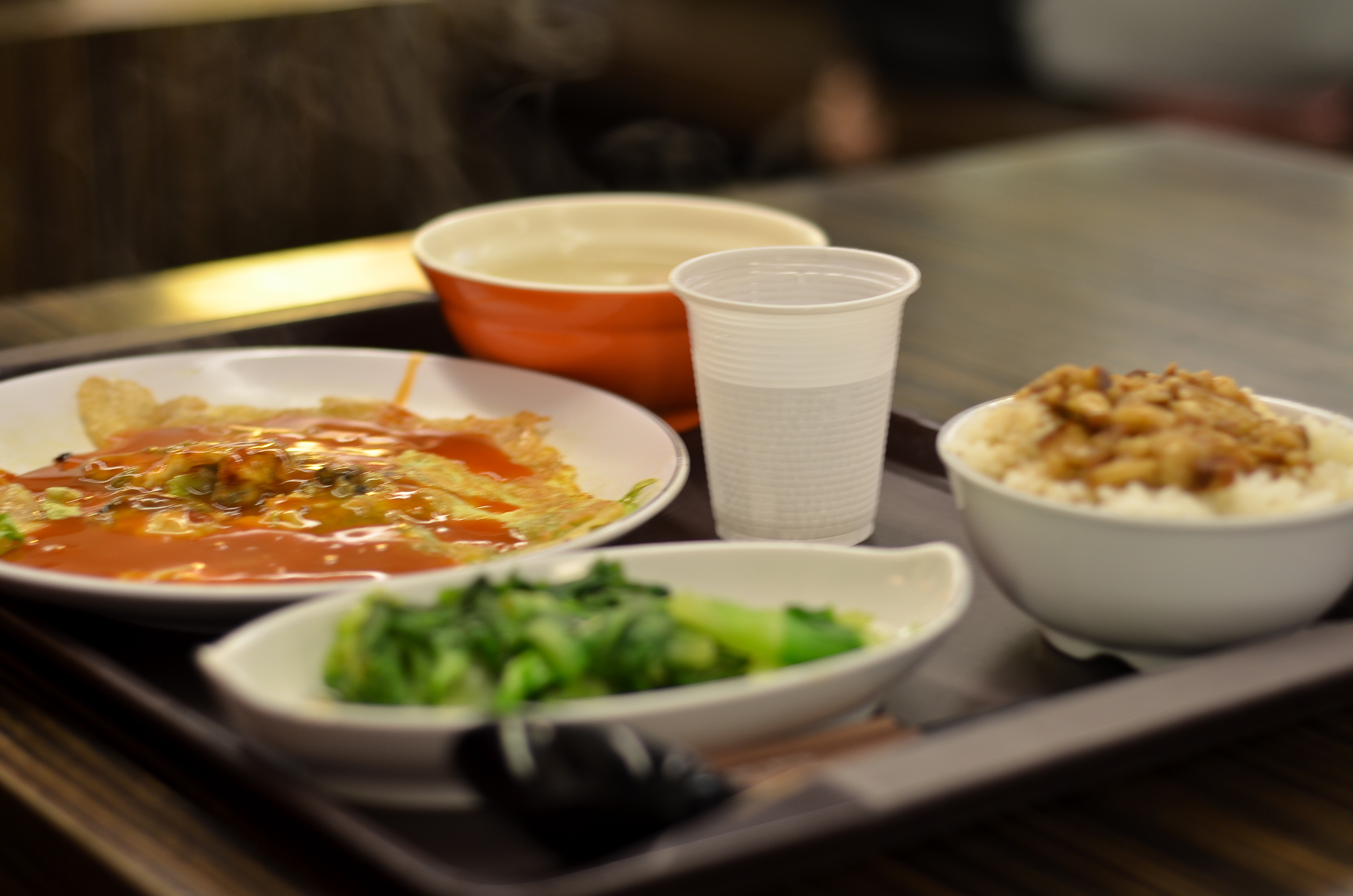 For lunch, we went up to the second floor of the station where there were numerous restaurants and a Starbucks. I decided to eat from a smaller place that served 小吃 (small eats), basically the Taiwanese equivalent of tapas. My first meal in Taiwan was thus oyster omelette (蚵仔煎, a Taiwan favorite), along with my beloved minced pork over rice, soup with fish balls, and some green veggies.