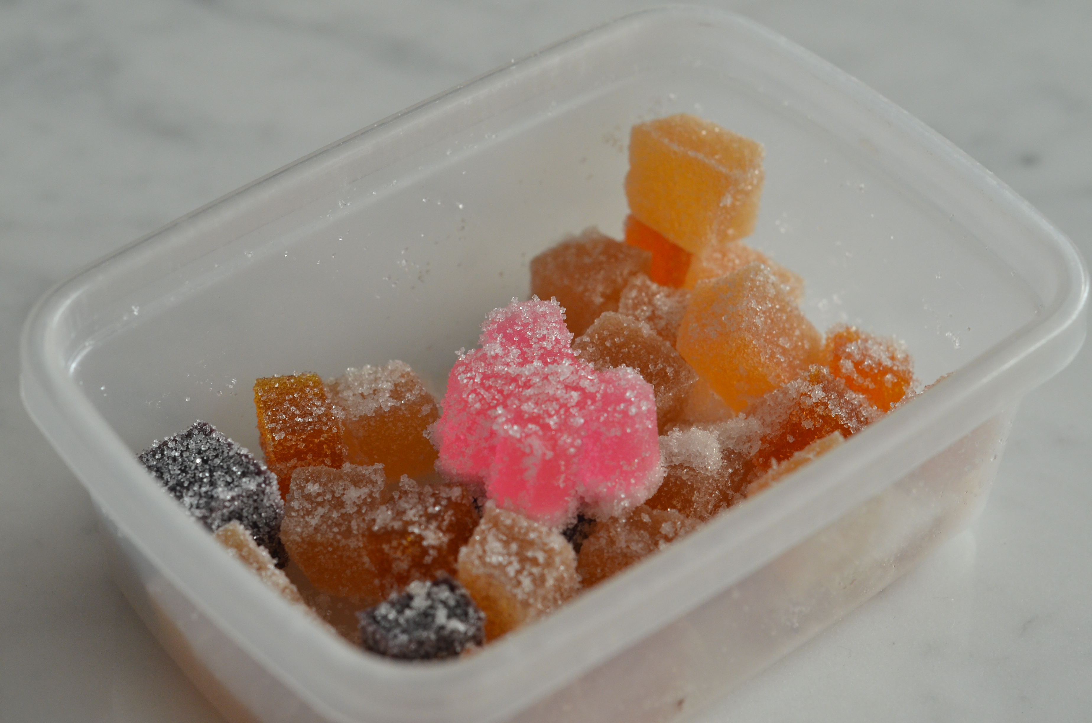In addition to sampling some of these, my aunt also gave me some homemade fruit candy! They were cut into cubes and cute flowers, then coated with sugar.