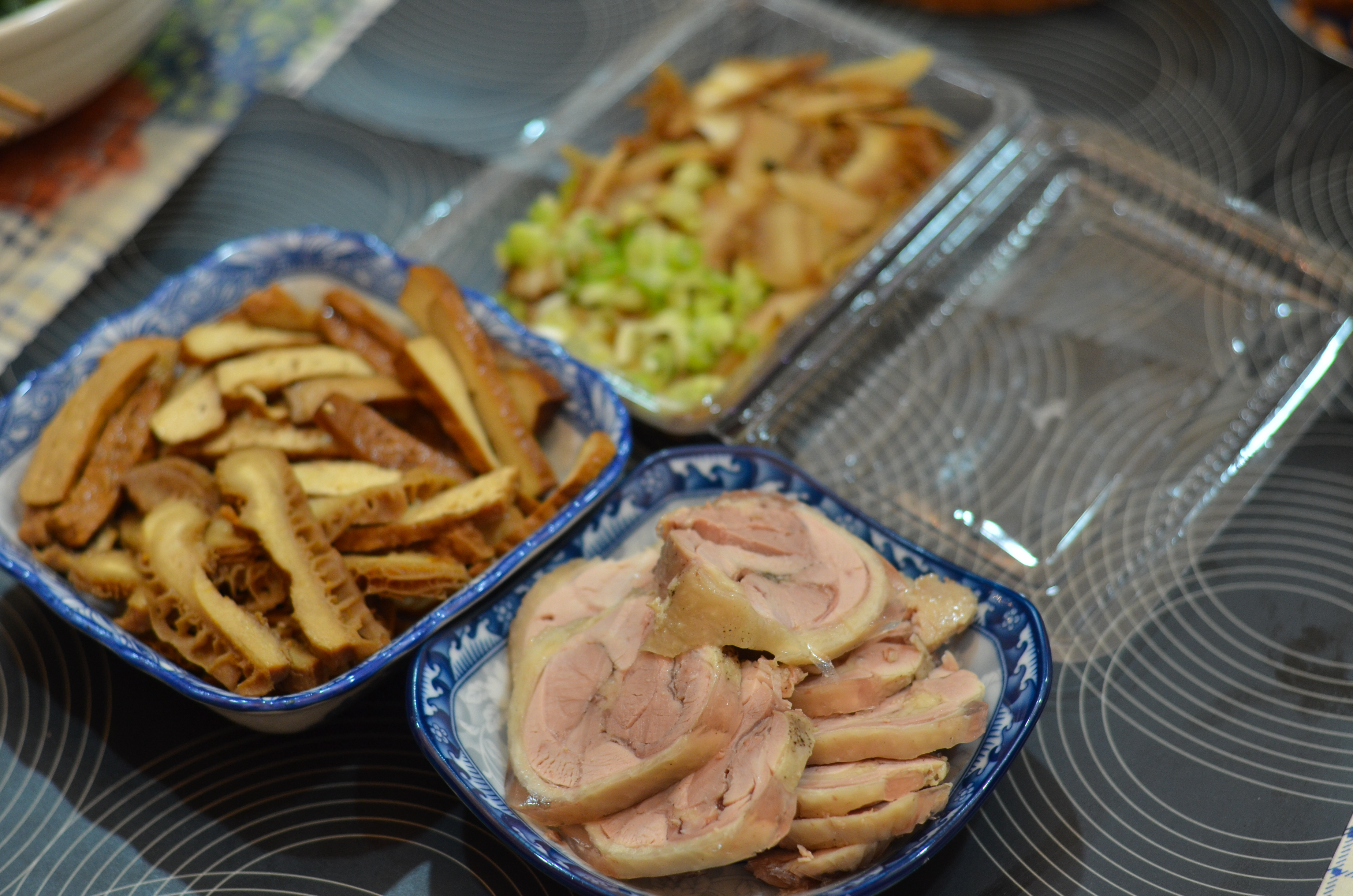My aunt's mother had sent over some food, including a special dish of chicken that had been rolled up tightly, marinated for a day, and then cooked (steamed?). My mom had recently mentioned to my aunt that a few years ago she had had dinner with them and had really enjoyed this chicken. My aunt probably told this to her mother yesterday, and she kindly made it again and sent it to us.