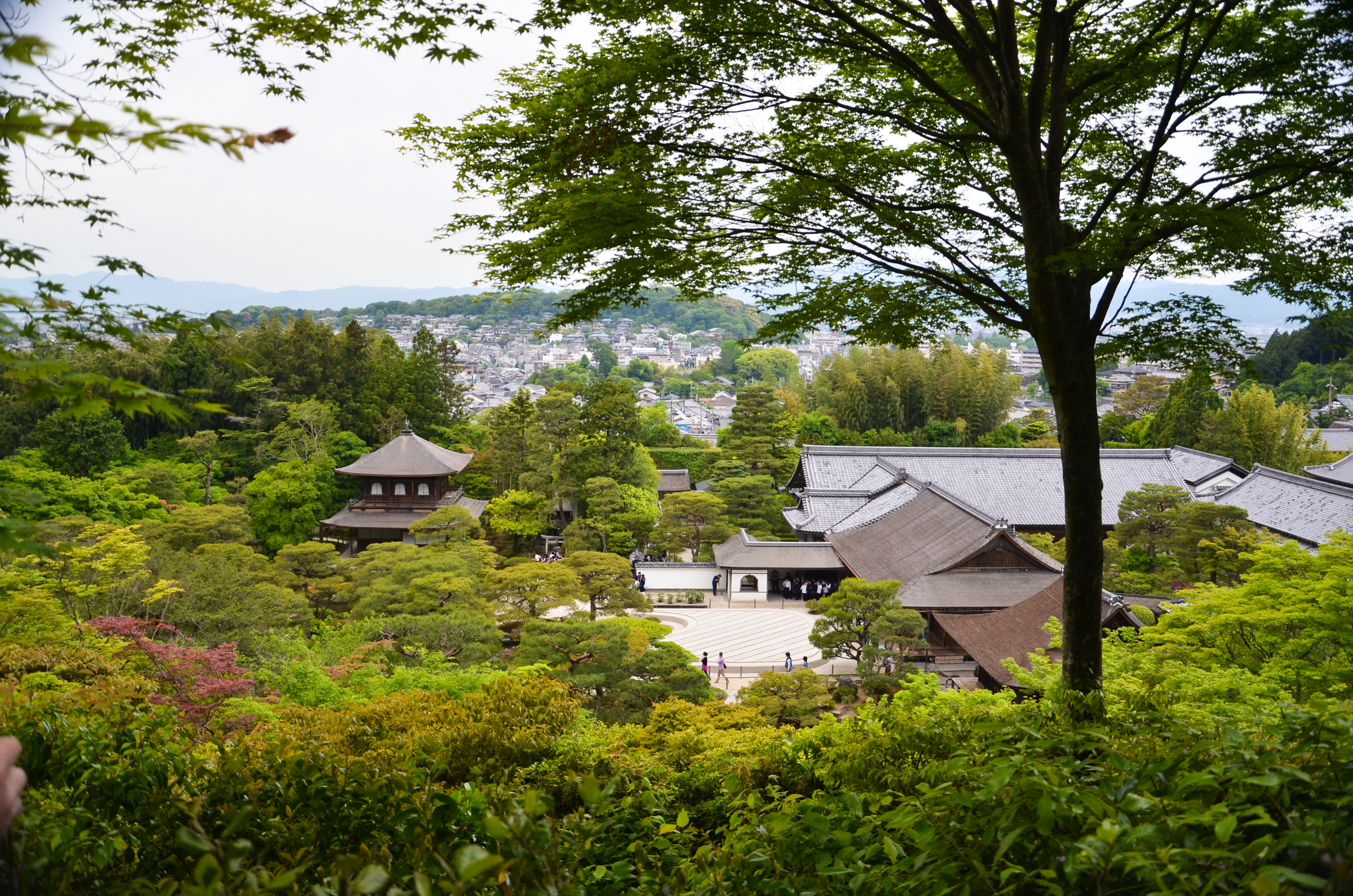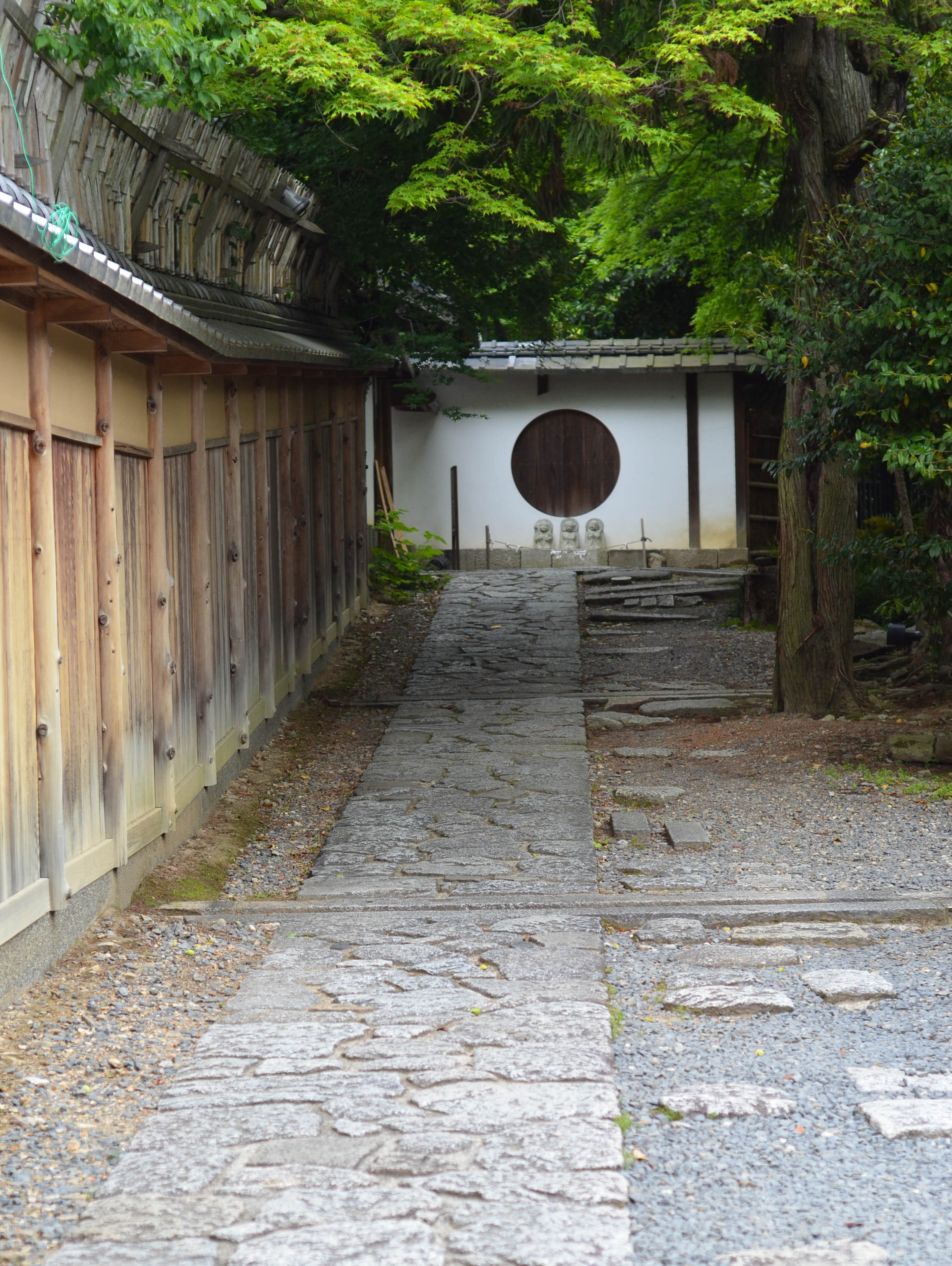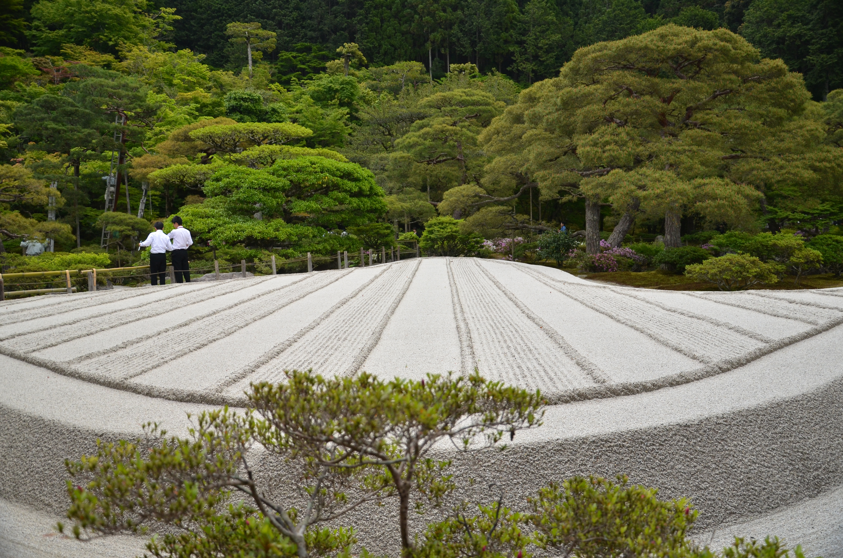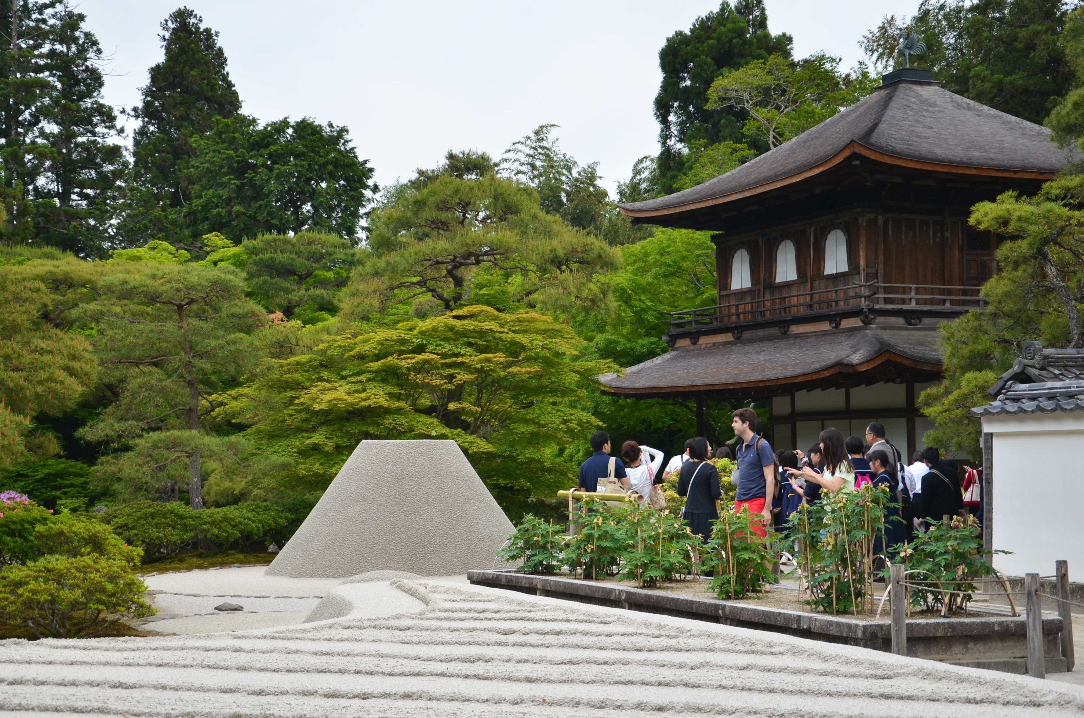 We then retraced our steps and followed the Philosopher's Walk to Ginkakuji temple. Ginkakuji was originally going to be the silver counterpart of the famous, golden Kinkakuji (we'll go there tomorrow), but the construction was delayed for a long time, so the temple never got its silver color. Instead, Ginkakuji is known for its sand gardens, where the sand is swept into patterns and a peculiar, custard pudding-shaped pile.