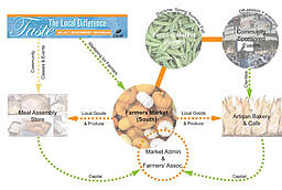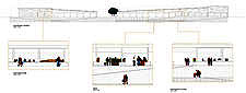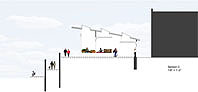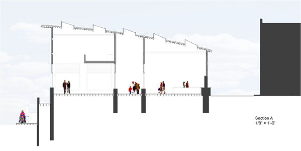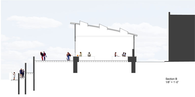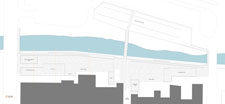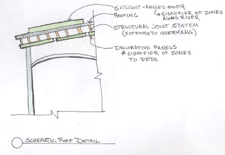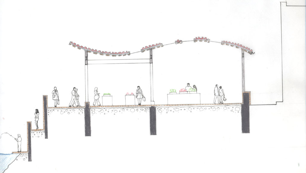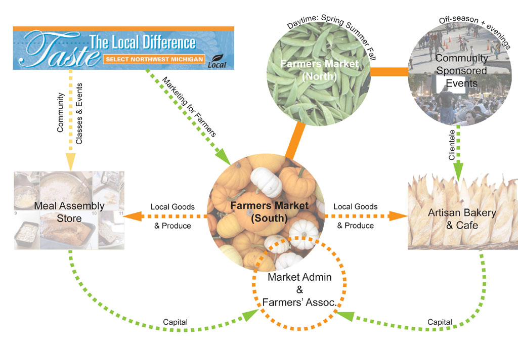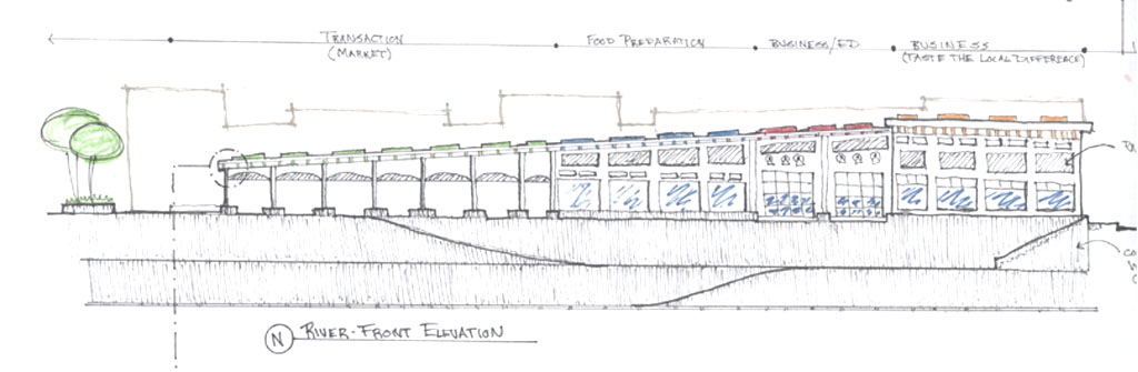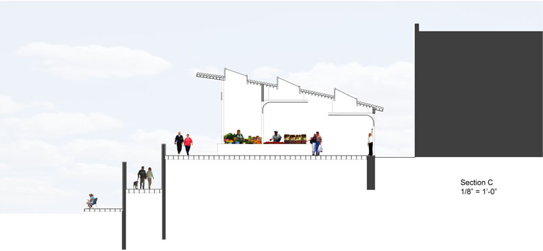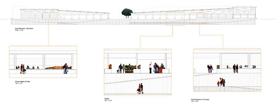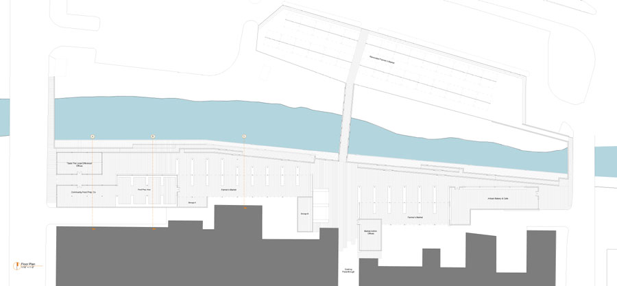 Downtown Traverse City has made a commitment to Urbanize – surface parking lots have been condensed to strategically placed decks, and the downtown population continues to increase. The popular Farmers Market has outgrown the much-loved seasonal site along the North side of the Boardman River, and the Local Farmers Association is looking to expand and be more inclusive of other local farmers. This Market Hall proposal seeks to address these issues by providing a food-centered program for the following community stakeholders: (1) the Traverse City Farmers Market, (2) “Taste the Local Difference” (a division of the Michigan Land Use Institute) and (3) two other core-businesses that promote the economy for the above two – an Artisan Bakery/Café and a Meal Assembly Store. Based on previous research, the Market Hall proposes to create a core year-round market that is an extension of the existing seasonal Farmers Market that provides fresh local-grown foods and produce to everyone (not just those who can afford it), by becoming a business built by the above stakeholders. The site is chosen along the South side of the river, behind the block of Front Street between Union and Cass. This site is optimal because of its proximity to the existing farmers market (which will be upgraded, but remain intact), and the existence of a valued pass-through from Front Street to the river. The design of the project aims to acknowledge the layers of the downtown area, by adding a more vibrant (food) layer to the back of Front Street, as well as emphasizing the descent to the riverfront, making it a more enjoyable and accessible public space. An attempt will be made to mitigate and repair the existing water runoff into the river (it is currently not a suitable condition). The proposal also promotes the business of food – growing + selling, preparing and eating, by revealing these processes through materials and the pedestrian experience. While the stakeholders have specific programs located within the site, pedestrian activity through and around the Market Hall encourage other sorts of urban vitality – street vendors, push-cart sellers, gatherings, and festivities.