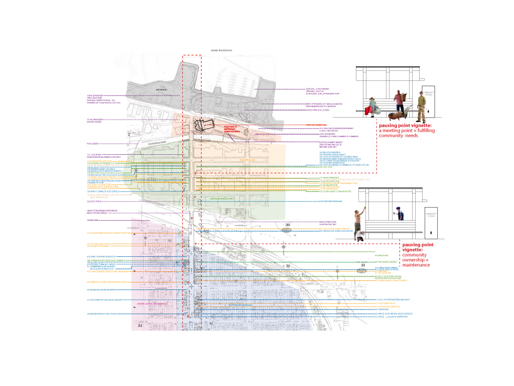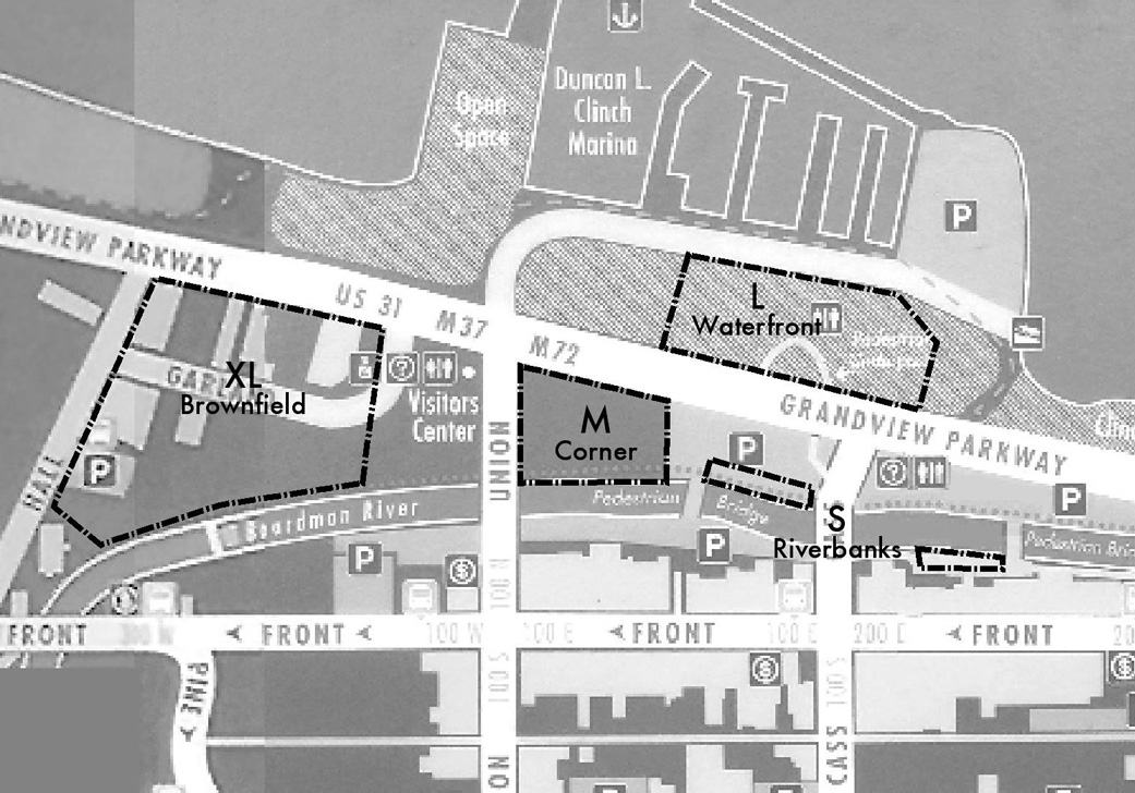 We chose Traverse City for this project because among Michigan cities it best represents relationships between tourist economy, ex-urban second home development, traditional food growers’ businesses, and issues in civic waterfront redevelopment. This is the “cherry capital of America” but also the effective capital of Michigan’s second-home boom and lakeside tourism. The waterfront has been opened by the recent removal of a power plant, and already serves as the site for the city’s farmers’ market. Although this is a carefully planned downtown site, it is nevertheless also exurban because of the whole town’s relationship to the region and the state. Like our abstract roadside satellite, this too a drive-by site. Grandview Parkway can get over 30,000 vehicles a day. Waterfront access across this road was the main focus of the recent study by thesis students in TCAUP and SNRE. The downtown plan has active provisions for local business, civic amenities, pedestrian pathways, open space management, and creating waterfront views. The drive-by public favors the latter. Actual residents favor the farmers’ market in its current parking lot location, but also have interest in related waterfront amenities, such as the marina, a “children’s garden” variant on the former zoo, and Front St. businesses. The prospect for all of these interlocking into a civic space of exceptional quality is very real.