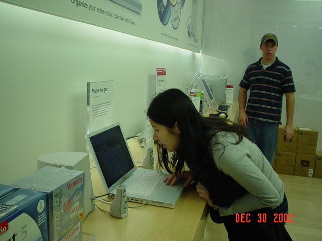 This is Jen Leung, looking intently at an Apple Power Book at the Apple Store in Woodfield Mall.